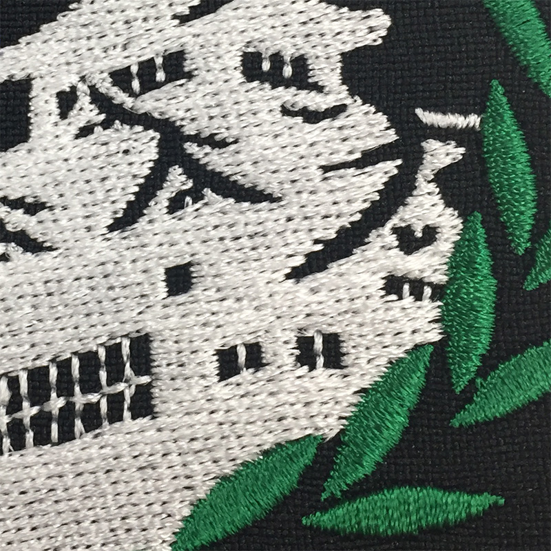 普通に見える月桂樹の刺繍ですが、高密度で打ち込んでいますので、立体感があり、またアウトラインも綺麗な曲線を描けています。