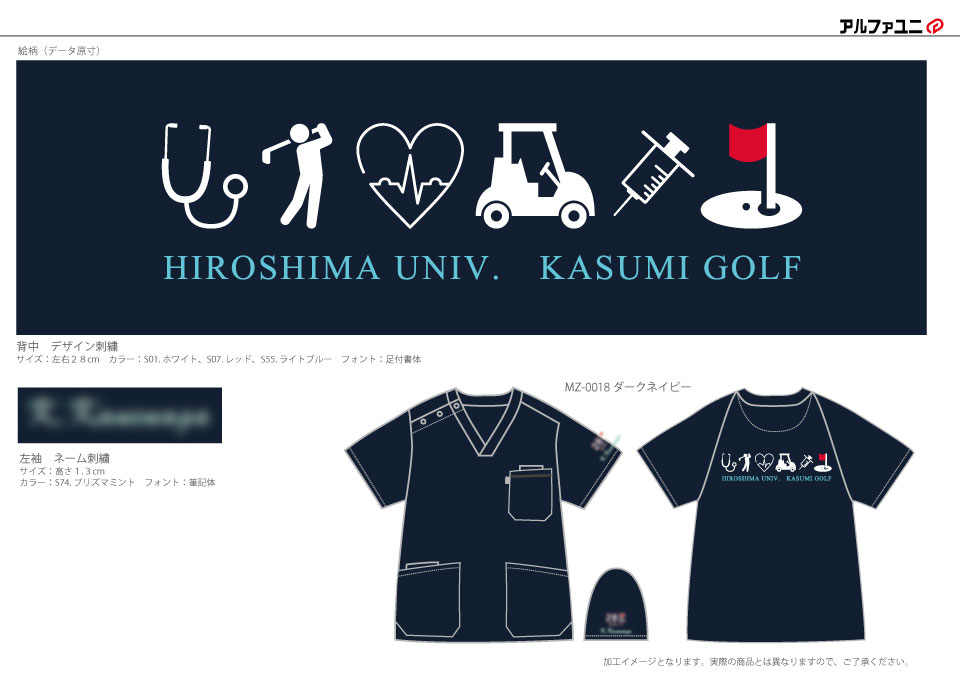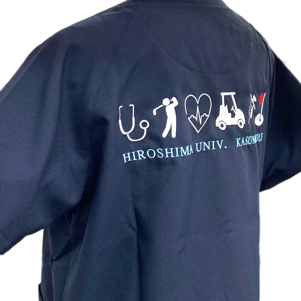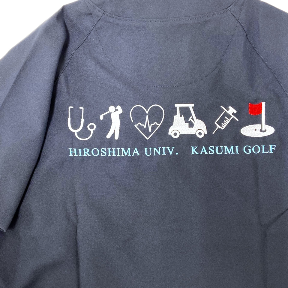 デザイン刺繍 広島大学霞ゴルフ部様 背中刺繍デザイン スポーツハート乗り物細かい文字背中 広島大学霞ゴルフ部様スクラブ背中刺繍デザインのご紹介です。このたびは製作のご依頼ありがとうございました。 このデザインについて 【刺繍加工のポイント】 ハート&心電図・聴診器・注射器はすべてサテンステッチで、その他のゴルフ関連イラストはたたみステッチ中心で縫いました。 たたみステッチはかなり細かく高密度に打ち込みましたので、スクラブのネイビー生地がほとんど透けることなくホワイトのカラーが綺麗に再現できていますし、洗濯後の歪みも抑えられます。 刺繍位置 :背中 刺繍サイズ:左右28cm 刺繍カラー:3色 ホワイト・レッド・ライトブルー 使用スクラブ:MIZUNO MZ-0018スクラブ この記事をシェア