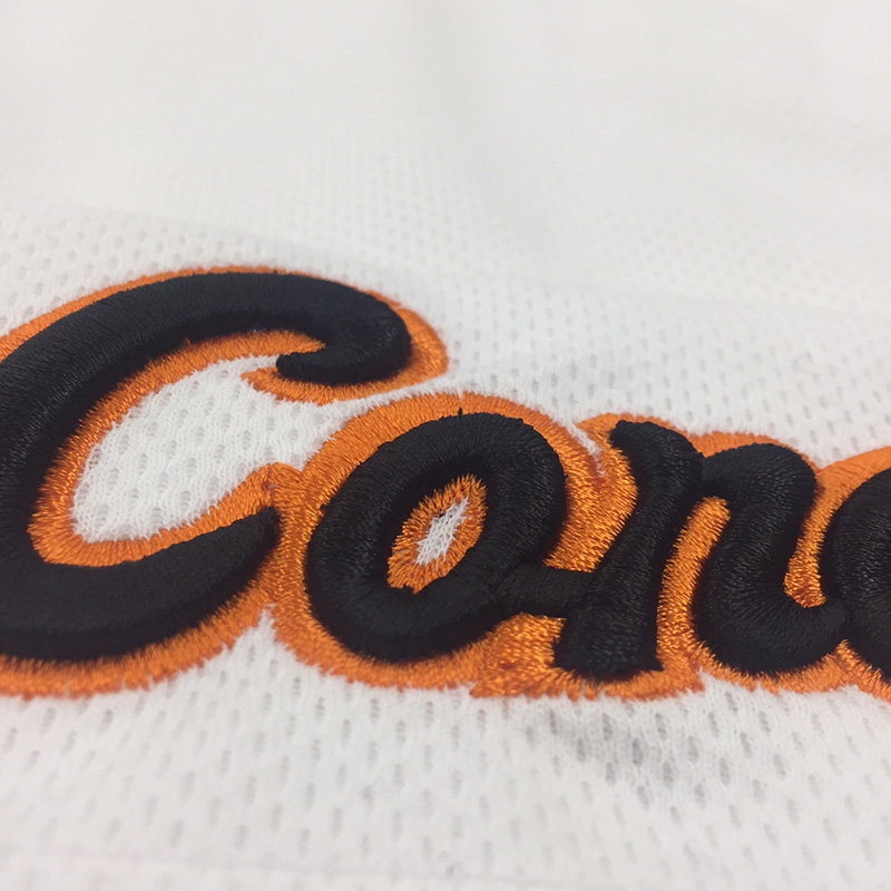 2色刺繍の縁取りのブラックの部分は通常の刺繍で、オレンジの文字の部分を3D刺繍にしています。