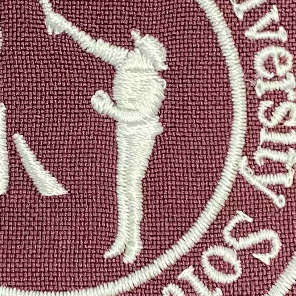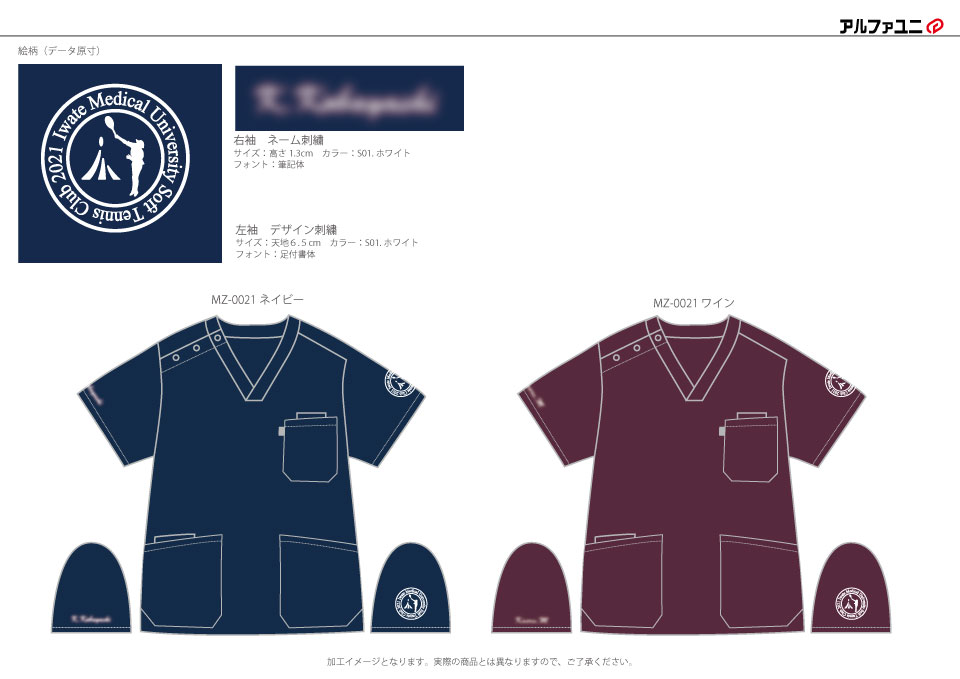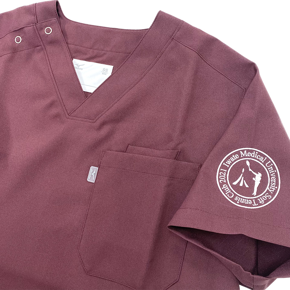 デザイン刺繍 岩手医科大学ソフトテニス部様 左袖刺繍デザイン 1色スポーツ円形(丸型)デザイン袖 岩手医科大学ソフトテニス部様スクラブ左袖刺繍デザインのご紹介です。このたびは製作のご依頼ありがとうございました。 このデザインについて 【刺繍加工のポイント】 小さくて見づらいですが、円の中の人がテニスをしているシルエットの刺繍をご覧下さい。 5枚目の画像はそれを拡大したものとなっています。元のデザインは1色ベタ表現(平面)となっていますが、刺繍にしたときにそのシルエットをパーツごとに分解し、表現していることが確認できると思います。 頭と顔、胴体、腕、脚、ラケットが1つ1つ別々に分かれていますので、小さいながらも、立体感のある仕上がりになっています。これがプリントではできない刺繍の良さです。 但し、このようにするか平面として1つのオブジェクトとして表現するか、刺繍型(パンチデータ)を作る人の拘りですので、作成者によって変わります。 アルファユニではこのような細かいところにも気を付けながら刺繍をしています。 刺繍位置 :左袖 刺繍サイズ:天地6.5cm 刺繍カラー:1色 ホワイト 使用スクラブ:MIZUNO MZ-0021スクラブ この記事をシェア