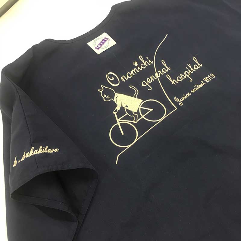 デザイン刺繍 JA尾道総合病院研修医2019様 Hランクかわいい動物背中複雑タイプ JA尾道総合病院研修医2019様スクラブロゴマーク刺繍デザインのご紹介です。 製作のご依頼ありがとうございました。 このデザインについて 【刺繍加工のポイント】 猫が乗っている自転車の車輪が元デザイン通り真円に近く刺繍できたことで非常にきれいな仕上がりとなります。 また、Onomichiの「i」の点が肉球になっている部分ですが、肉球全体約1㎝弱、小さい点が2㎜弱となっておりますが、 こちらも何とか再現ができました。 刺繍位置 :背中 刺繍サイズ:左右28cm 刺繍カラー:ベージュ この記事をシェア