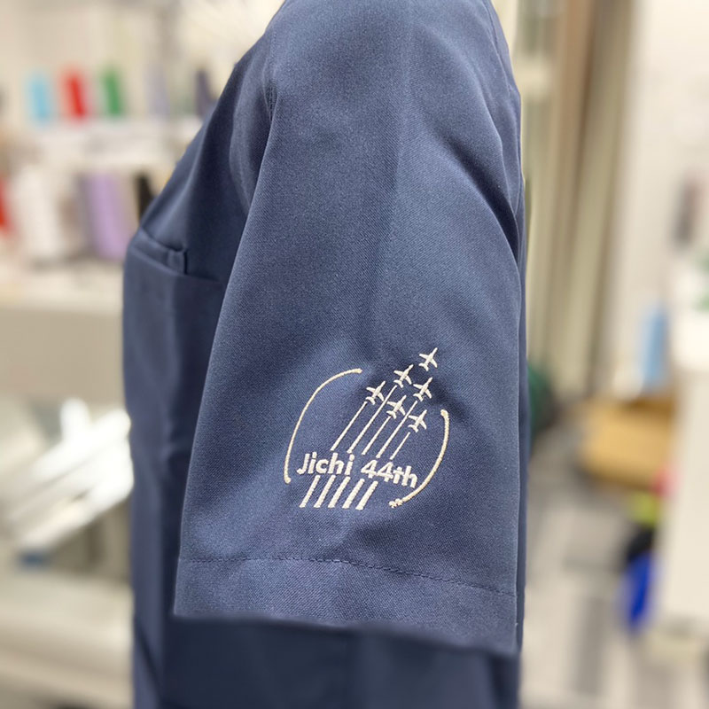 デザイン刺繍 自治医科大学44期様 Bランク乗り物袖 自治医科大学44期様スクラブロゴマーク刺繍デザインのご紹介です。このたびは製作のご依頼ありがとうございます。 このデザインについて 刺繍位置 :左袖 刺繍サイズ:天地6cm 刺繍カラー:1色 ホワイト 今年はコロナ禍という大変な状況下で、ブルーインパルスが東京の空を舞い、医療機関で働く方に勇気を与えてくれました。 シンプルでありながら、スタイリッシュなデザインですね! 使用スクラブ:MIZUNO MZ-0021スクラブ ネイビー この記事をシェア