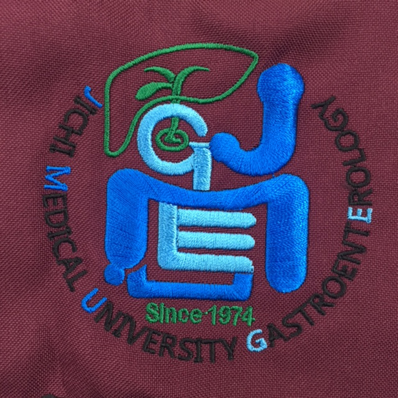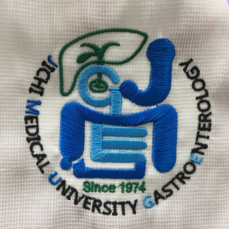 デザイン刺繍 自治医科大学内科学講座消化器内科学様 Cランクドクターコート円形(丸型)デザイン細かい文字袖複雑タイプ 自治医科大学内科学講座消化器内科学部門様スクラブ・ドクターコート刺繍デザインのご紹介です。製作のご依頼ありがとうございました。 このデザインについて 【刺繍加工のポイント】 イラスト中央のMマークを表しているオブジェクトは太いため、普通はたたみ打ちで加工するのですが、全体のバランスを考慮し、サテン打ちで加工しました。 全体的に非常に立体感が出ています。 刺繍位置:左袖 刺繍サイズ:左右7.8㎝ 刺繍カラー:4色 S02.ブラック S18.グリーン S27.ブルー S28.サックス 白衣とスクラブの両方に刺繍を入れました。 この記事をシェア