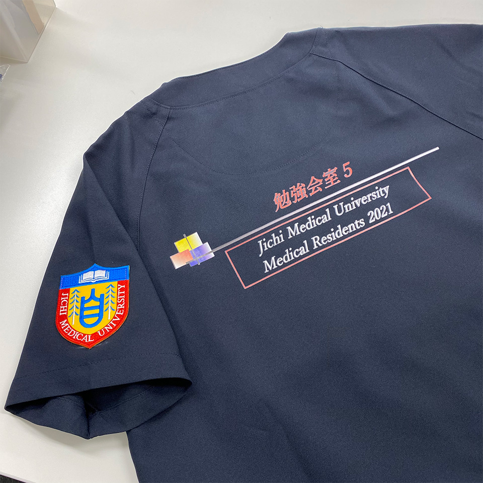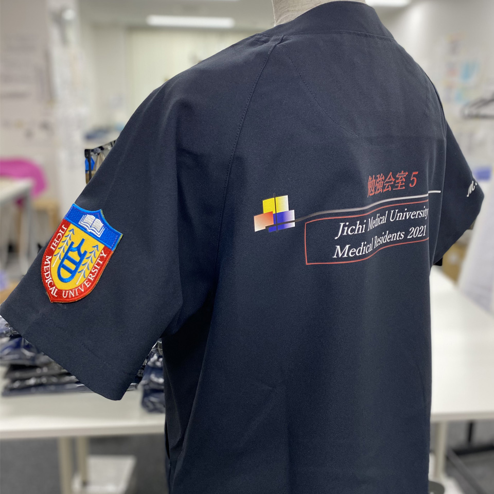 左袖に自治医科大学の校章をデザインした刺繍ワッペンを縫い付けました。