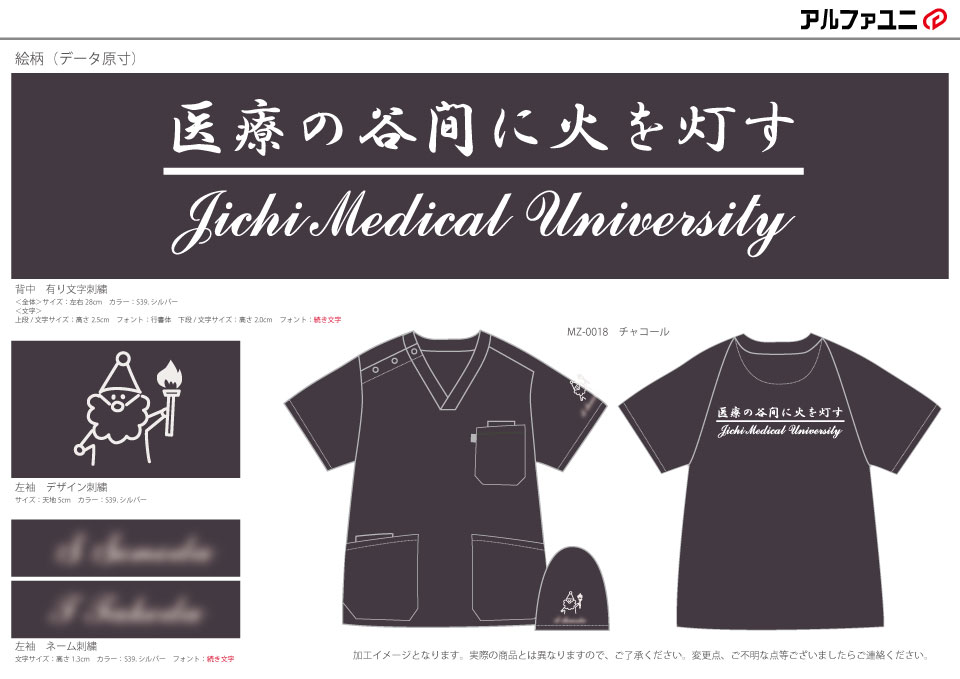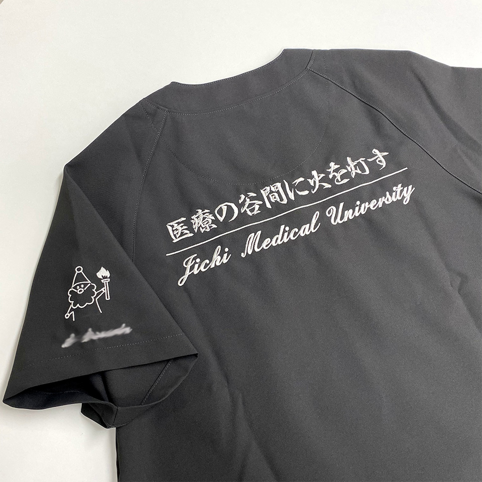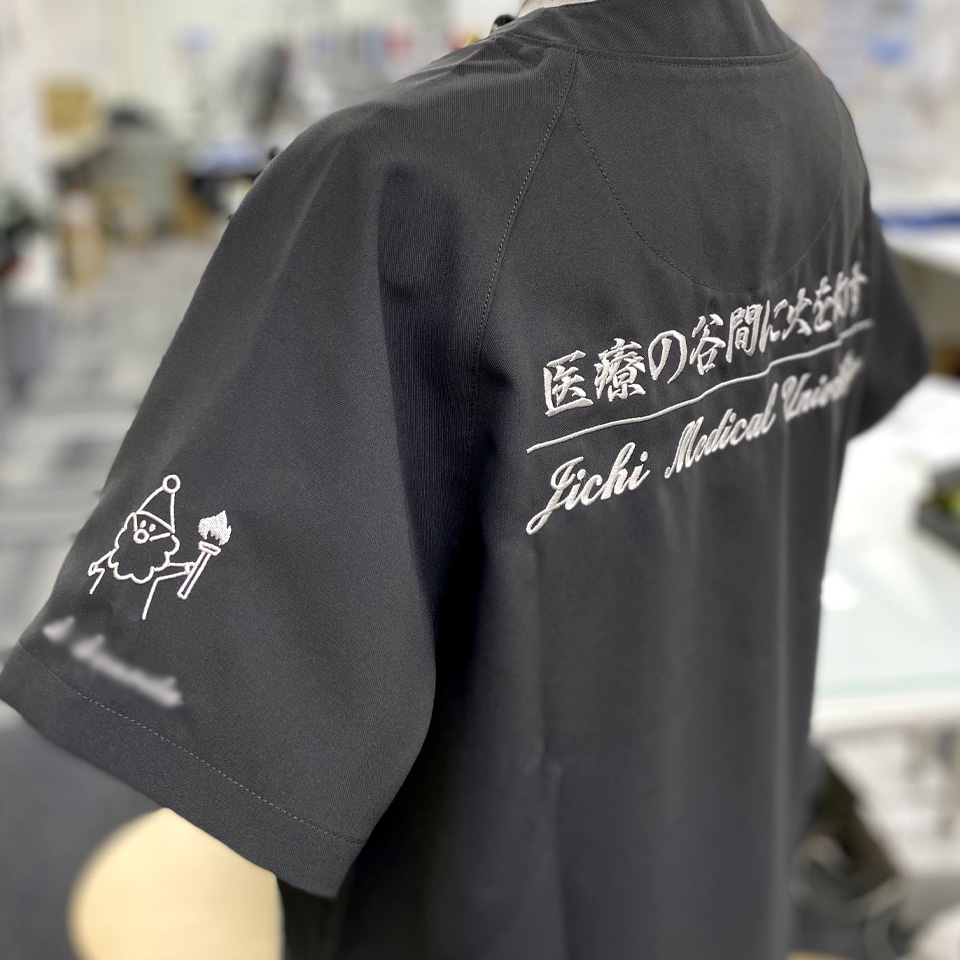 デザイン刺繍 自治医科大学様 1色Aランクかわいいキャラクターシンプル袖 自治医科大学様スクラブロゴマーク刺繍デザインのご紹介です。このたびは製作のご依頼ありがとうございました。 このデザインについて 【刺繍加工のポイント】 背中は有り文字刺繍となります。 書体 :上段 行書体、下段 続き文字 上代の文字高さ2.5cmですが、それなりもボリューム感が出せているかと思います。 刺繍位置:左袖/背中 刺繍サイズ:デザイン刺繍天地5cm、ネーム刺繍高さ1.3㎝/左右28㎝、上段高さ2.5㎝、下段高さ2㎝ 刺繍カラー:デザイン刺繍1色 シルバー、ネーム刺繍1色 シルバー/1色 シルバー 使用スクラブ:MIZUNO MZ-0018スクラブ この記事をシェア