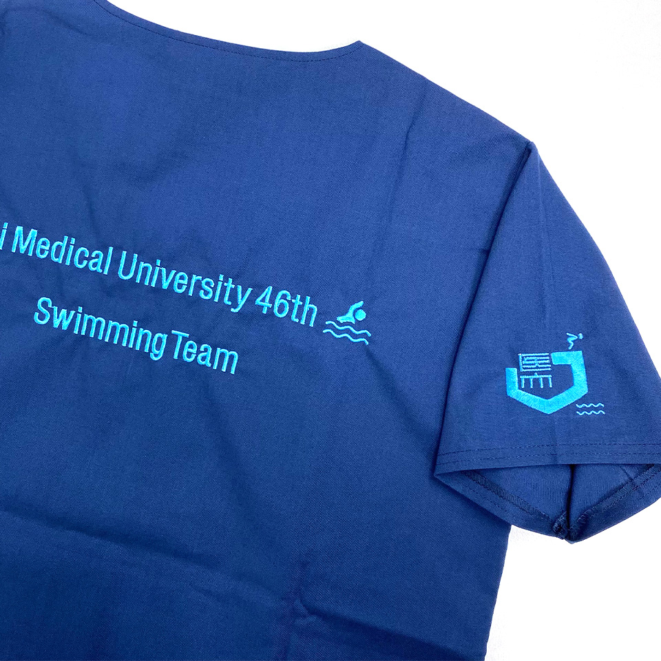 自治医科大学46th水泳部様スクラブ右袖刺繍デザインのご紹介です。