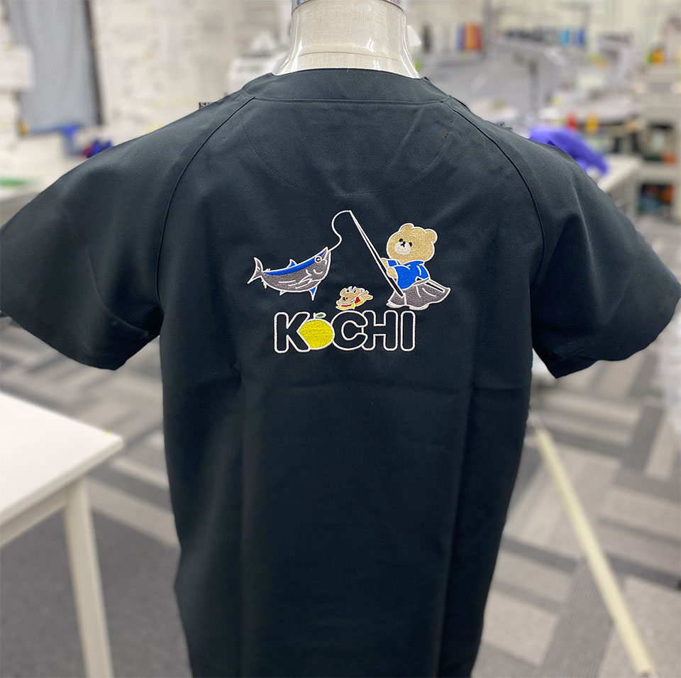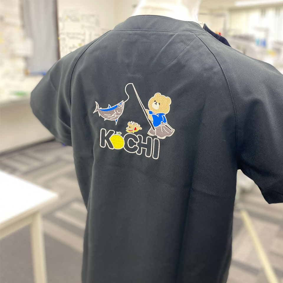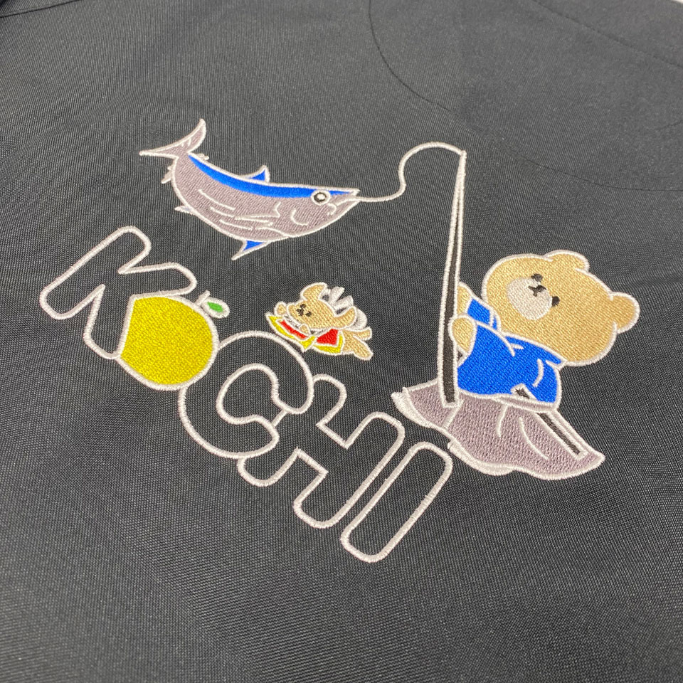 デザイン刺繍 自治医科大学高知県人会2023様 カラフルかわいいキャラクターフルーツ刺繍動画あり動物背中高運針数デザイン 自治医科大学高知県人会2023様スクラブロゴマーク刺繍デザインのご紹介です。 背中に高知ご当地カツオとクマ、土佐犬のイラストを大きく刺繍しました。このたびは製作のご依頼ありがとうございました。 このデザインについて 【刺繍加工のポイント】 背中刺繍ということで、大きな面を埋める刺繍はたたみ打ちで行っております。 ポイントとしては、そのたたみ打ちの目の細かさと目が綺麗に揃っていることで綺麗な仕上がりになっているところです。 また、イラストのたたみの面のアウトラインを白糸(サテン打ち)で縁取っていますが、はみ出すことなく全体を線で綺麗に押さえられたことで、しっかりした見栄えになっていると思います。 中央の小さい土佐犬のイラストは、刺繍で潰れないよう弊社で調整をさせていただきました。 刺繍サイズが左右18cmと数字的に見ると小さい印象ですが、高さもあるデザインであり、刺繍ということで存在感が大きいことから、それなりに大きな仕上がりになっています。ちなみに針数は25000針を超えています。 文字を中心とした2段程度の平均的な背中の刺繍が17000針ですので、左右18cmで25000針オーバーということでかなりの針数です。 刺繍代は針数の多さからかなり高くなりましたが、刺繍型代割引キャンペーン(コロナに負けるな割引)をご利用いただき通常16000円の型代が5670円とお安くご提供させていただきました。 刺繍位置 :背中/右胸 刺繍サイズ:左右18cm/左右3.5cm(既存型使用) 刺繍カラー:背中 8色 S01. ホワイト、S02.ブラック、S07. レッド、S14. イエロー、S81. グレー、S19. ライム、S54. るり、S37.クリーム 右胸 1色 ホワイト 使用スクラブ:MIZUNO MZ-0021スクラブ ブラック この記事をシェア