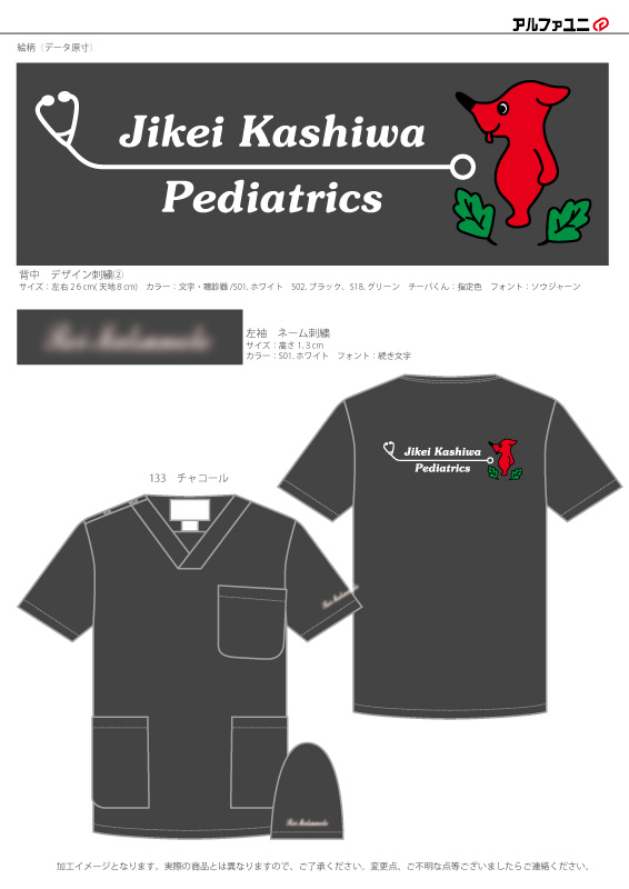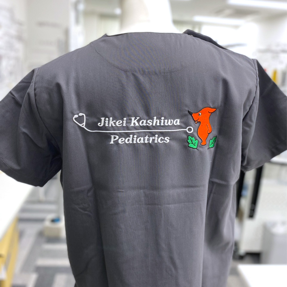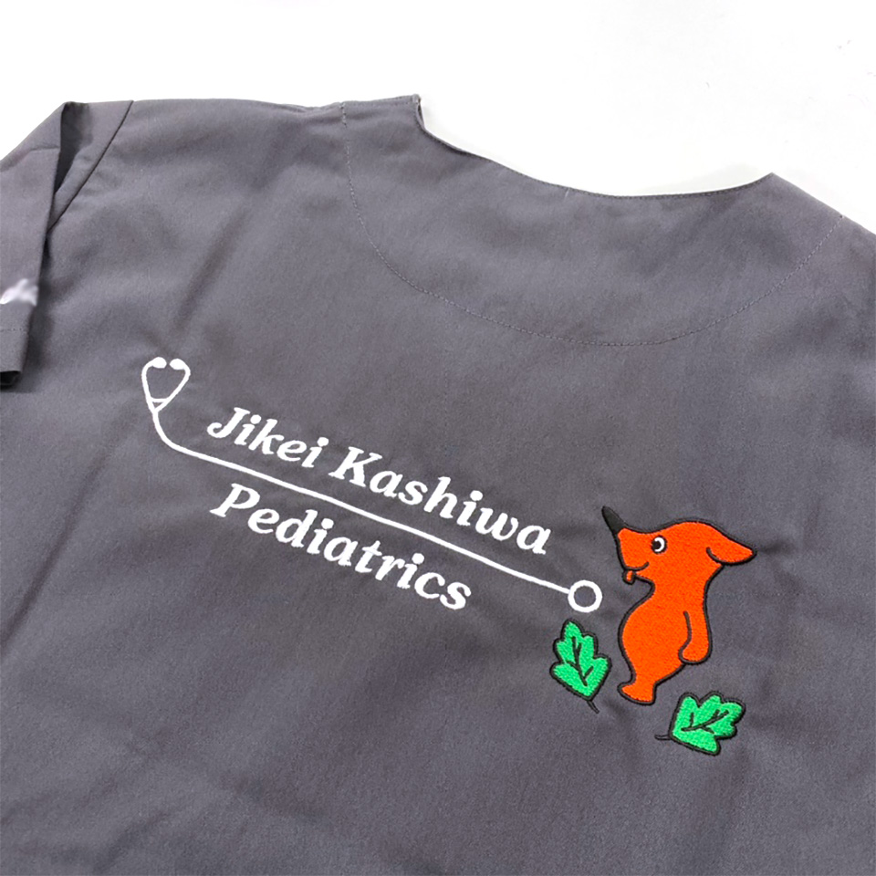 デザイン刺繍 東京慈恵会医科大学附属柏病院小児科様 133スクラブ Dランクキャラクター聴診器背中複雑タイプ 東京慈恵会医科大学附属柏病院小児科様スクラブロゴマーク刺繍デザインのご紹介です。このたびは製作のご依頼ありがとうございました。 このデザインについて 刺繍位置 :背中デザイン刺繍/左袖ネーム刺繍 刺繍サイズ:左右28cm/高さ1.3cm 刺繍カラー:背中デザイン刺繍4色 ホワイト・ブラック・グリーン・チーバくん指定色/左袖ネーム刺繍1色 ホワイト 使用スクラブ:KAZEN 133スクラブ この記事をシェア