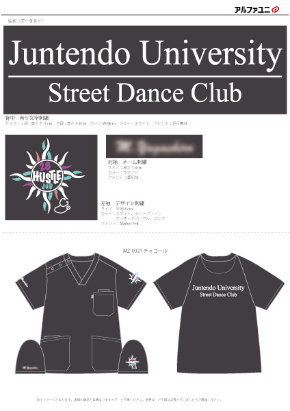 デザイン刺繍 順天堂大学ストリートダンス部様 MZ-0021 Cランクカラフルかわいいスポーツ聴診器袖 順天堂大学ストリートダンス部様スクラブロゴマーク刺繍デザインのご紹介です。このたびは製作のご依頼ありがとうございました。 このデザインについて 刺繍位置 :左袖/背中/右袖 刺繍サイズ:天地8cm/上段高さ2.5cm、下段高さ2cm、全体左右28cm/右袖高さ1.3cm 刺繍カラー:左袖4色 ホワイト・ミントグリーン・オーキッドパープル・ピンク/背中1色 ホワイト/右袖1色 ホワイト 使用スクラブ:MIZUNO MZ-0021 この記事をシェア
