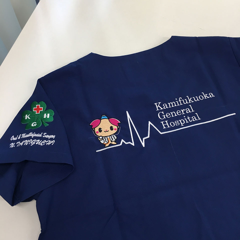 デザイン刺繍 上福岡総合病院様 Dランクかわいいキャラクター心電図聴診器背中袖複雑タイプ 上福岡総合病院様スクラブロゴマーク刺繍デザインのご紹介です。このたびは製作のご依頼ありがとうございます。 製作したスクラブの袖にはそれぞれに所属科名を入れて、病院全体で着用いただいているようです。 背中の刺繍にはふじみ野市のゆるキャラ「ふじみん」がドクターコートを着たオリジナルデザインを入れました。 このデザインについて 【刺繍加工のポイント】 ふじみんのような細かいオブジェクトが組み合わさり、罫線で囲んでいるデザインの場合、罫線から内側のたたみの糸がはみ出ることがあります。 実際に試し打ちではそのように糸がはみ出てしまったので、調整し、量産加工を行いました。 刺繍位置 :背中/左袖 刺繍サイズ:背中左右28㎝ 刺繍カラー:背中 9色 ホワイト・ブラック・ダークグレー・ライトグレー・サックス・ホットピンク・フレッシュ・オレンジ 4色 ホワイト・レッド・グリーン・ダークグリーン 背中の針数はかなり多くなり約2万針となりました。 この記事をシェア