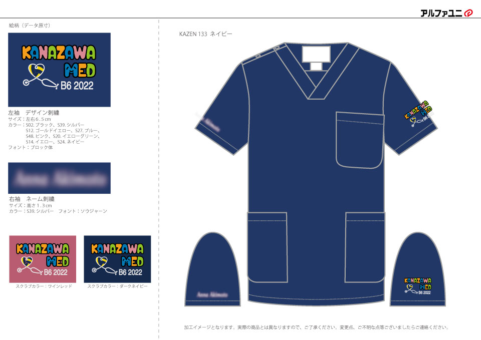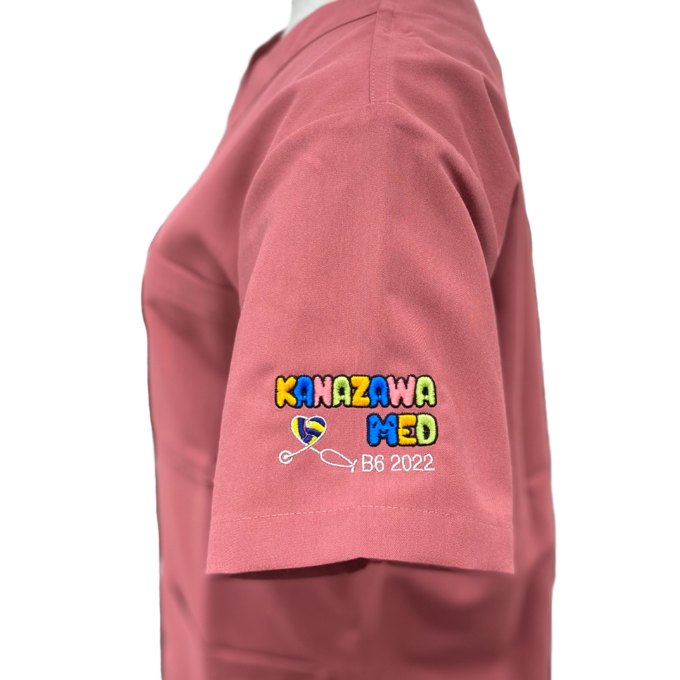 金沢医科大学バレーボール部2022様スクラブ左袖刺繍デザインのご紹介です。8色使用のカラフルなデザイン刺繍です。