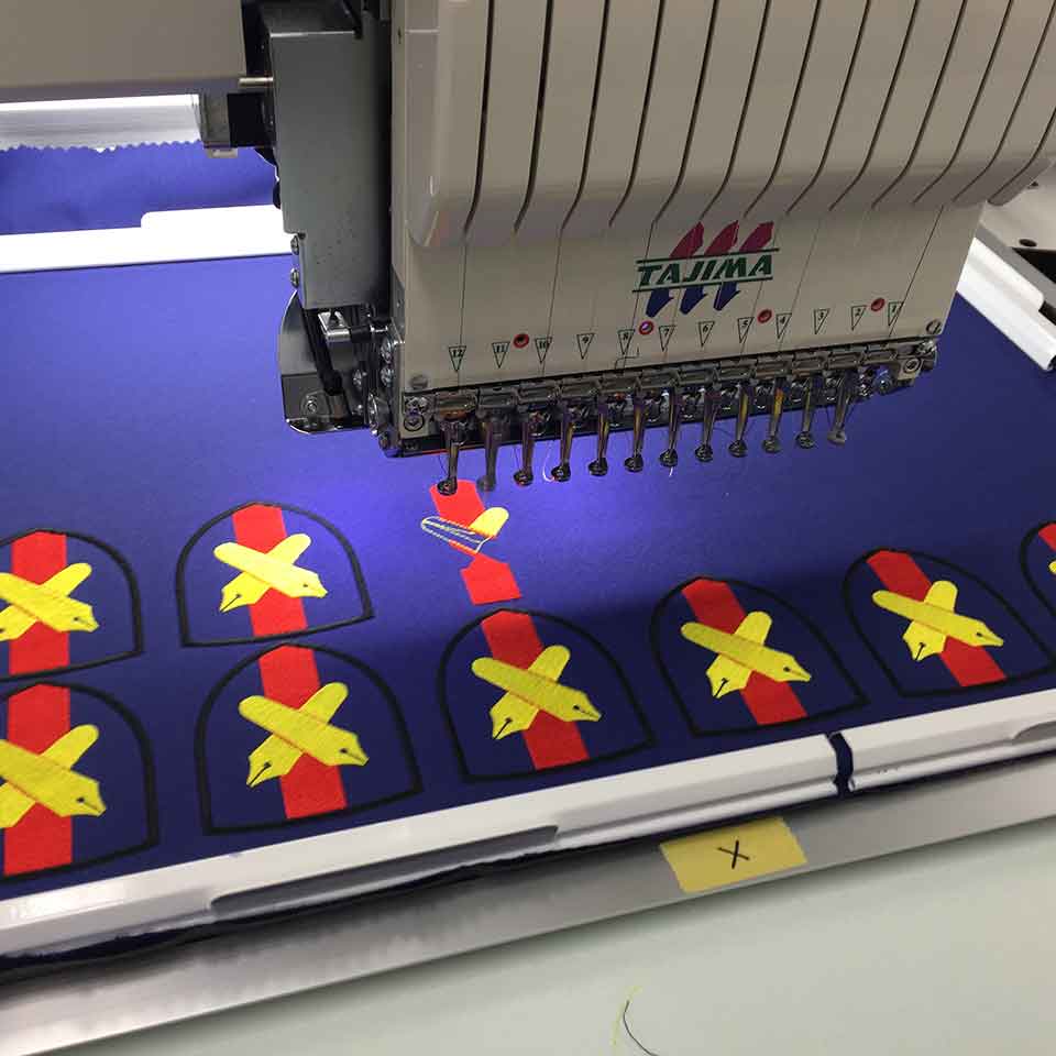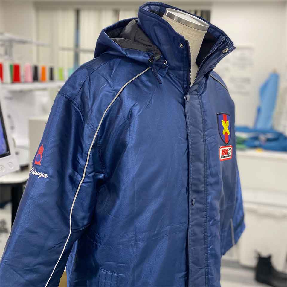 左胸下段の四角型刺繍ワッペンは、下段の文字数が多く、何とか希望のサイズに収めるために、文字間をぎりぎりまで詰めて、何とかきれいに文字が再現できました。