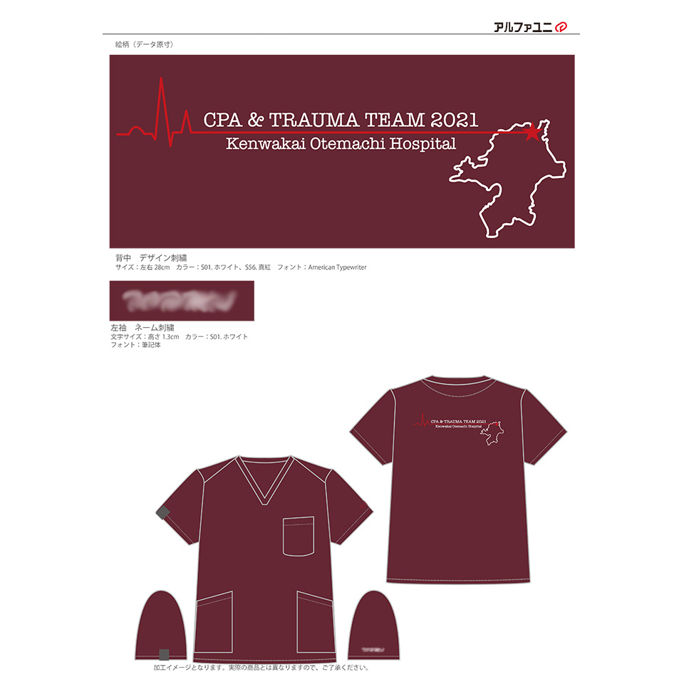デザイン刺繍 健和会大手町病院 外傷・CPAチーム様 背中刺繍デザイン Cランク地図背中 健和会大手町病院 外傷・CPAチーム様スクラブ背中刺繍デザインのご紹介です。このたびは製作のご依頼ありがとうございました。 このデザインについて 【刺繍加工のポイント】 福岡県の地図を罫線で表現しサテンステッチで表現しました。1周サテンステッチで打ちますと、意外と針数が多くなりますが、 文字も全体的に小さめで心電図のシンプルなデザインなので、針数としては14000針以下の背中シンプル刺繍ランクに収まりました。 刺繍位置 :背中 刺繍サイズ:左右28cm 刺繍カラー:2色 ホワイト・真紅 使用スクラブ:PANTONE® 7000SC スクラブ この記事をシェア