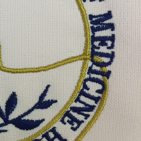 デザイン刺繍 近畿大学医学部附属病院レジデント38期様 Cランク円形(丸型)デザイン心電図聴診器胸 近畿大学医学部附属病院レジデント38期様スクラブ刺繍デザインのご紹介です。 製作のご依頼ありがとうございました。 このデザインについて 【刺繍加工のポイント】 心電図のような曲線の聴診器のデザインとネイビーの文字が一部重なっている部分がありますが、 ゴールドの線が、ネイビーの文字の下を抜けているように綺麗に抜き合わせられています。 刺繍位置 :右胸 刺繍サイズ:左右8cm 刺繍カラー:ゴールド、ネイビー この記事をシェア