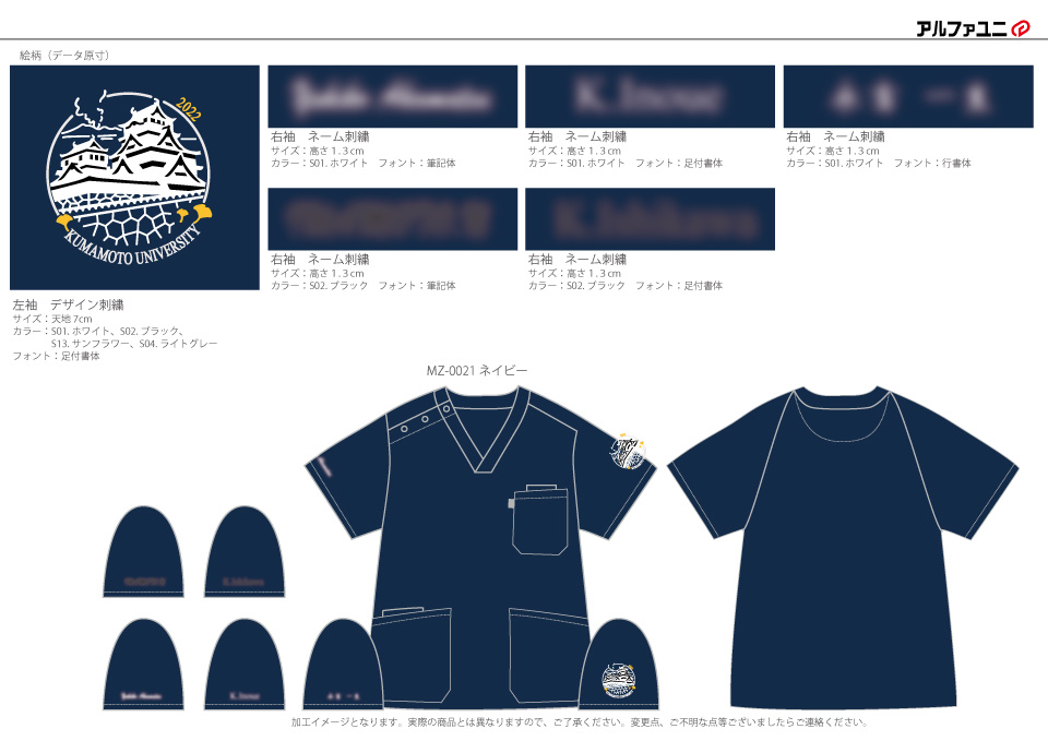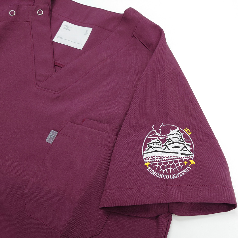 デザイン刺繍 熊本大学医学部2022年卒業生様 MZ-0021 円形(丸型)デザイン卒業記念建物袖複雑タイプ 熊本大学医学部2022年様卒業記念スクラブロゴマーク刺繍デザインのご紹介です。 毎年卒業記念スクラブの製作のご依頼をいただきありがとうございます。 年々、熊本城のデザインがバージョンアップしていることに感動を覚えます。 このデザインについて 【刺繍加工のポイント】 デザイン原案画像をご覧いただければ、最初にいただいたご希望デザインがかなり細かかったことがお分かりいただけるかと思います。元のイメージをできるだけ残したかったのですが、実際には刺繍で再現できる限界があったので、最終的にこのデザインになりました。 大学の校章に用いられているイチョウを入れたいという要望を受けました。限られたスペースの中に3つイチョウを入れ、一番小さいものは約5.5㎜サイズですが、何とか再現できました。窓の部分は抜きことができなかったので、糸で埋めています。 刺繍位置 :左袖デザイン刺繍/右袖ネーム刺繍 刺繍サイズ:天地7cm/高さ1.3cm 刺繍カラー:4色 ホワイト・ブラック・ライトグレー・サンフラワー/2色の中から1色を選択 ホワイト・ブラック この記事をシェア