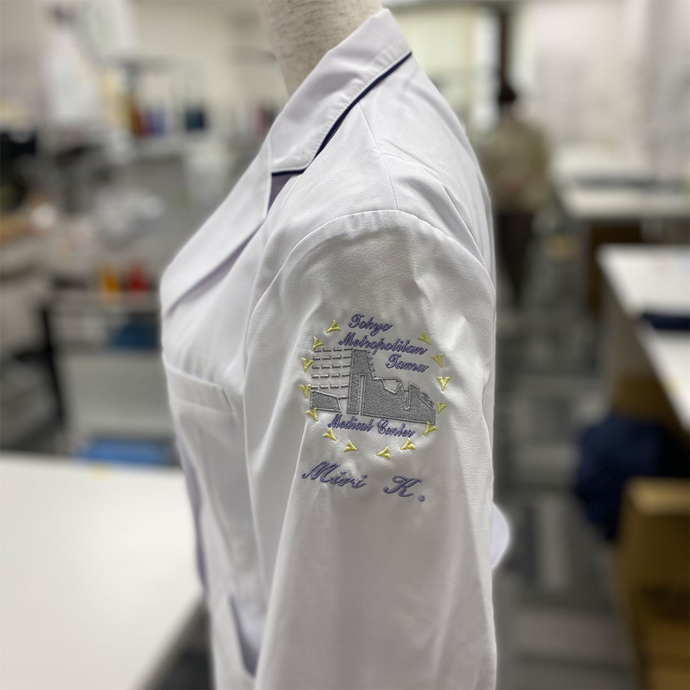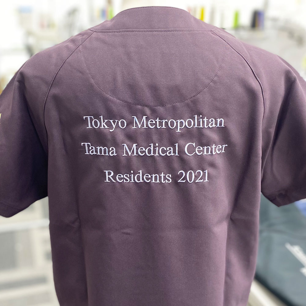 また、背中の有り文字刺繍サイズは左右20cm、文字サイズ1.5cmですが、3段にしたため、思ったよりもボリュームが出て存在感が出ています。文字サイズを大きくされたいというご要望をいただくのですが、病院名は文字数がどうしても多くなり、1段あたりの文字が小さくなってしまいますので、このように3段に改行して刺繍することも1つの選択肢です。