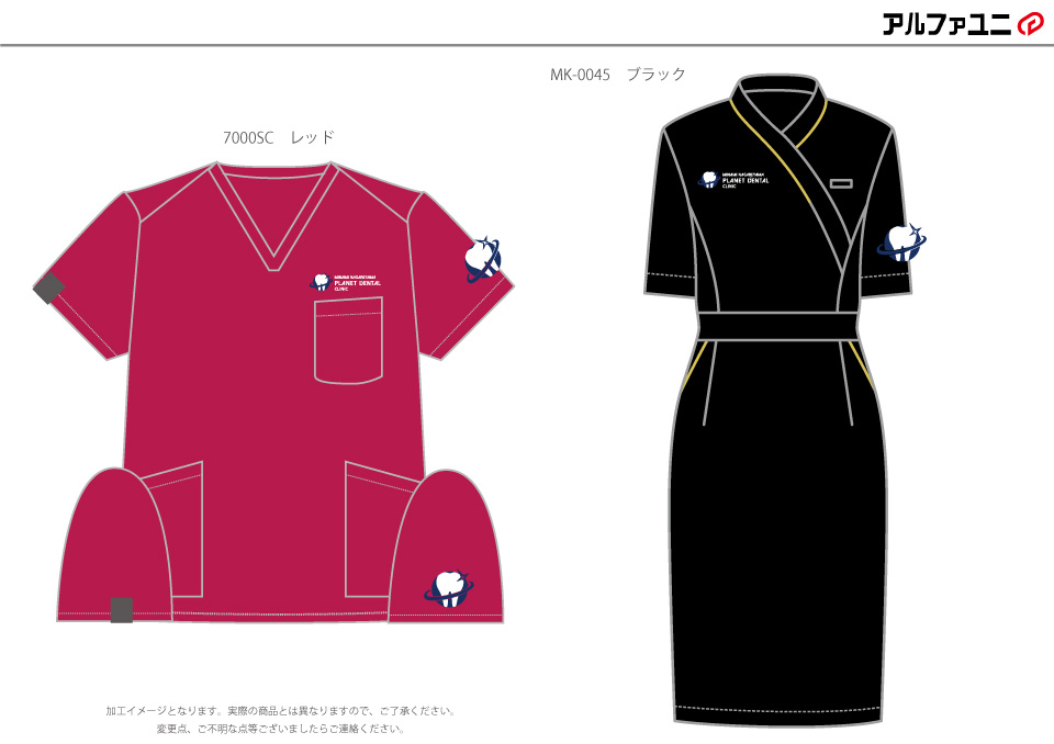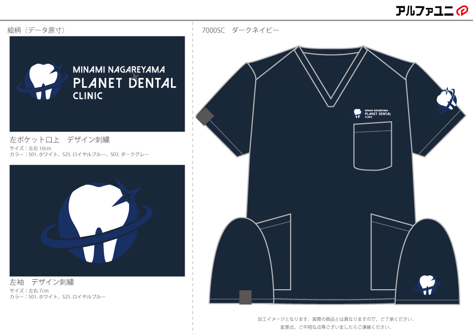 デザイン刺繍 南流山プラネット歯科クリニック様 7000SC AランクCランク円形(丸型)デザイン細かい文字胸袖複雑タイプ 南流山プラネット歯科クリニック様スクラブロゴマーク刺繍デザインのご紹介です。 このたびは製作のご依頼ありがとうございました。 このデザインについて 【刺繍加工のポイント】 円形のオブジェクトの中に歯のシルエットがあり、抜き合わせになっているデザインのため、合わせがずれたり、歯のシルエットが円形からはみ出さないように気を使い調整をしました。 刺繍位置 :左袖デザイン刺繍/左ポケット口上(ワンピース右胸)デザイン刺繍 刺繍サイズ:左右7cm/左右10cm 刺繍カラー:3色 ホワイト・ロイヤルブルー・ダークグレー/2色 ホワイト・ロイヤルブルー 使用スクラブ:FOLK 7000SCスクラブ、MICHEL KLEIN MK-0045ワンピース この記事をシェア