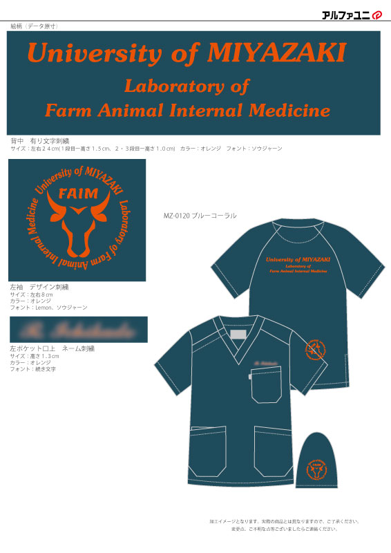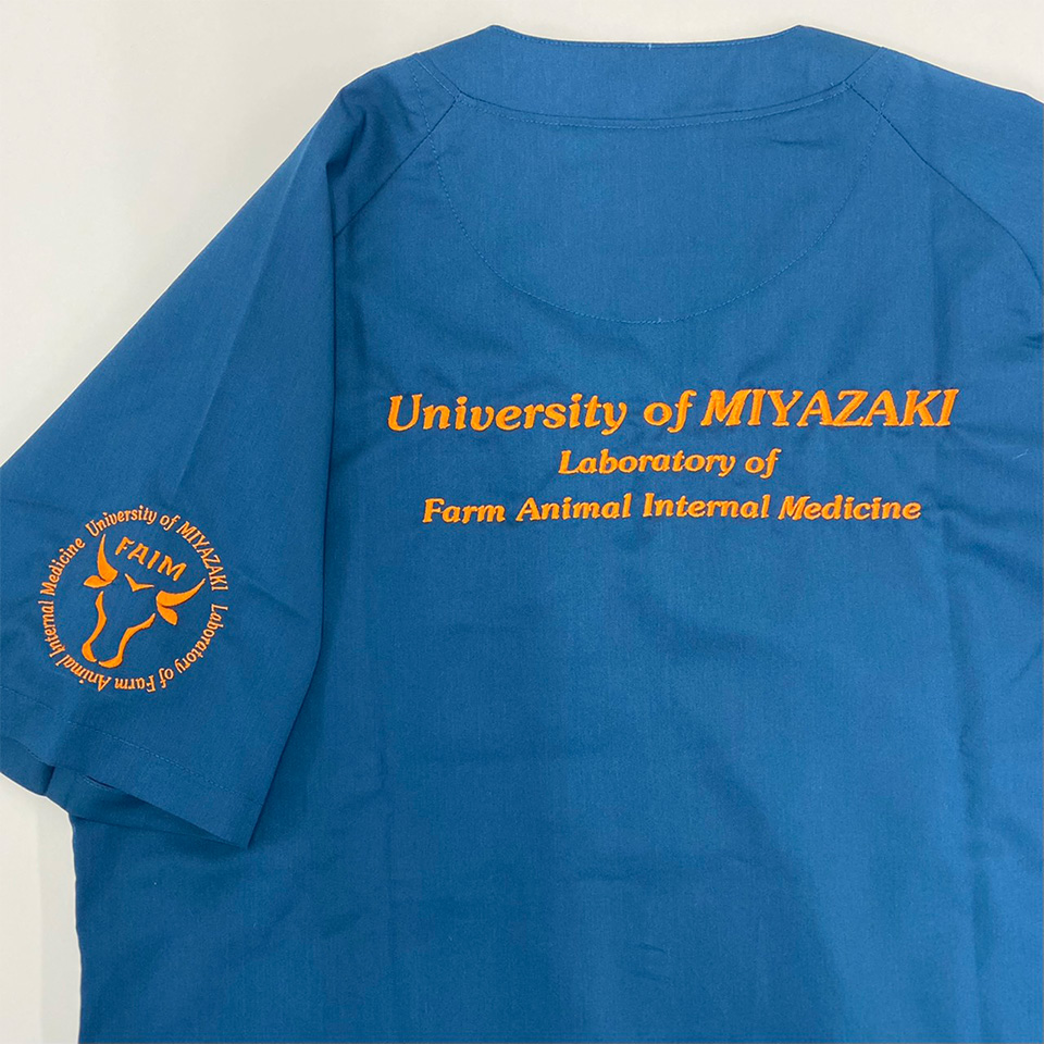 デザイン刺繍 宮崎大学農学部獣医学科様 1色Cランク円形(丸型)デザイン動物細かい文字袖 宮崎大学農学部獣医学科様スクラブロゴマーク刺繍デザインのご紹介です。このたびは製作のご依頼ありがとうございました。 このデザインについて 【刺繍加工のポイント】 袖のデザイン刺繍の周りの文字について、 文字数が多く限られたスペースに文字を入れ込むために等倍縮小すると文字が小さくなり潰れる可能性が高くなるので、 文字に長体をかけて(縦長文字)文字高さを確保した形で収めました。 刺繍位置 :左袖/背中/左ポケット口上 刺繍サイズ:左右8cm/左右24㎝(1段目高さ1.5㎝、2・3段目高さ1㎝)/高さ1.3㎝ 刺繍カラー:1色 オレンジ/1色 オレンジ/1色 オレンジ 使用スクラブ:MIZUNO MZ-0120スクラブ この記事をシェア