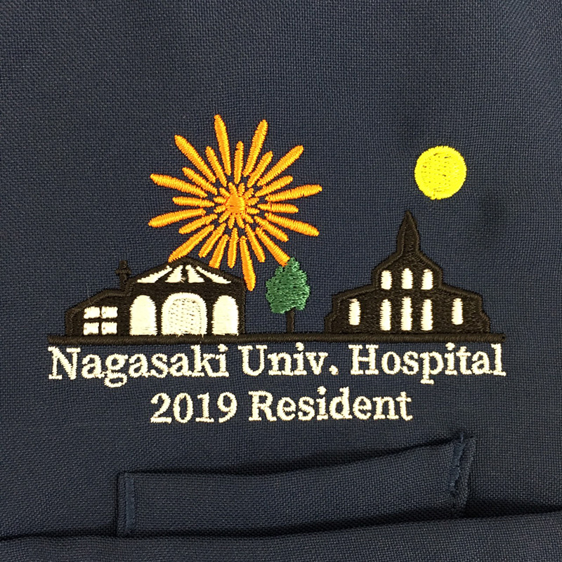 デザイン刺繍 長崎大学医学部附属病院医療教育開発センター様 カラフル建物胸複雑タイプ風景 長崎大学医学部附属病院様スクラブロゴマーク刺繍デザインのご紹介です。 製作のご依頼ありがとうございました。 このデザインについて 刺繍位置 :右袖 刺繍サイズ:左右8.5cm 刺繍カラー: パターン1…5色 ホワイト、ブラック、オレンジ、イエロー、ダークグリーン パターン2…5色 ホワイト、ダークグレー、オレンジ、イエロー、ダークグリーン 長崎を象徴する風景をデザイン化し、刺繍しました。 かなり細かいデザインでしたので、当初デザインを多少簡素化して最終デザインが確定しました。 原画もアップしておりますが、実際には建物3つ、それぞれの間に木を4つ入れたいという希望がありましたが、胸のスペースに収まるため、省略や簡素化しました。 逆に細かい部分については、刺繍できるよう拡大・増幅し、最終のデザインとなりました。 原画と刺繍デザインの画像を比較いただけると、刺繍でできる範囲が何となくお分かりになるかと思います。 ちなみに胸の場合は、左右11cm程度までは刺繍サイズ設定が可能です。 この記事をシェア