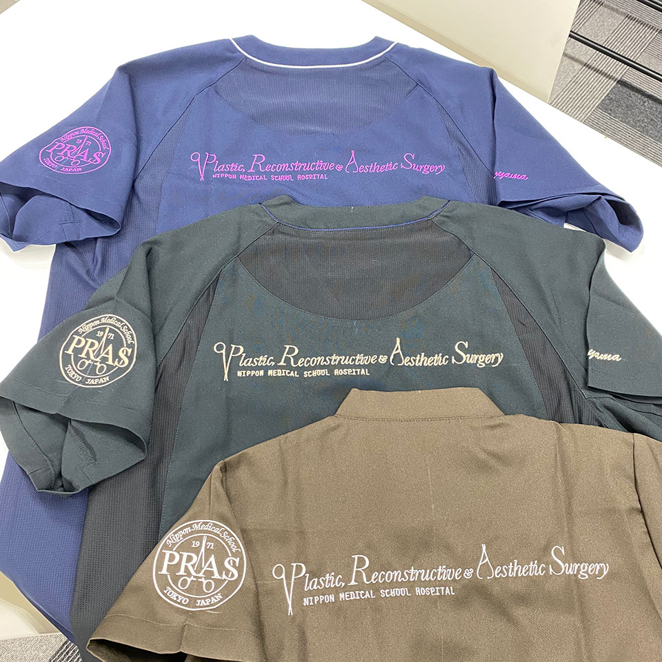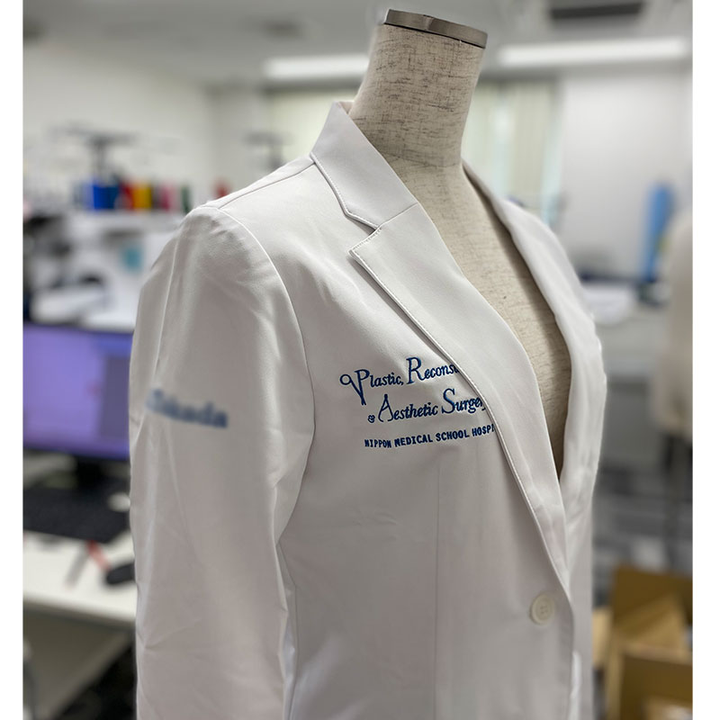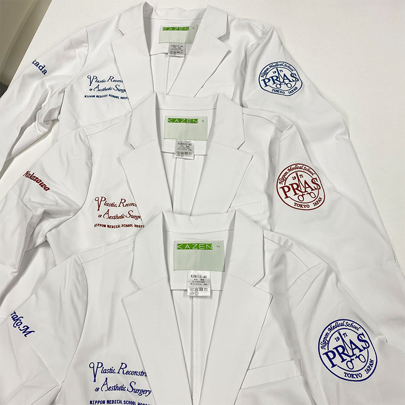 デザイン刺繍 日本医科大学形成外科2020様 CランクDランクドクターコート円形(丸型)デザイン細かい文字背中胸袖 日本医科大学附属病院形成外科2020様ドクターコート&スクラブロゴマーク刺繍デザインのご紹介です。 このたびは製作のご依頼ありがとうございました。 このデザインについて 【刺繍加工のポイント】 細い書体を希望されたので、元の書体をイメージが変わらない程度に若干太らせて刺繍しました。 それによって見栄えが良くなり、洗濯後の歪みも押さえることができます。 また、色替えが大変多く苦労しました。 刺繍位置 :左袖/右胸/背中 刺繍サイズ:左袖左右8cm/右胸左右10.5㎝/背中左右28㎝ 刺繍カラー:1色で色替えあり ブラック・ダークネイビー・マロン・バイオレット・オーシャン・デニム・ロイヤルブルーなど 使用ドクターコート1:KAZEN KZN111メンズブレザー 使用ドクターコート2:KAZEN KZN112レディースブレザー 使用スクラブ1:KAZEN 133スクラブ 使用スクラブ2:MIZUNO MZ-0215スクラブ この記事をシェア