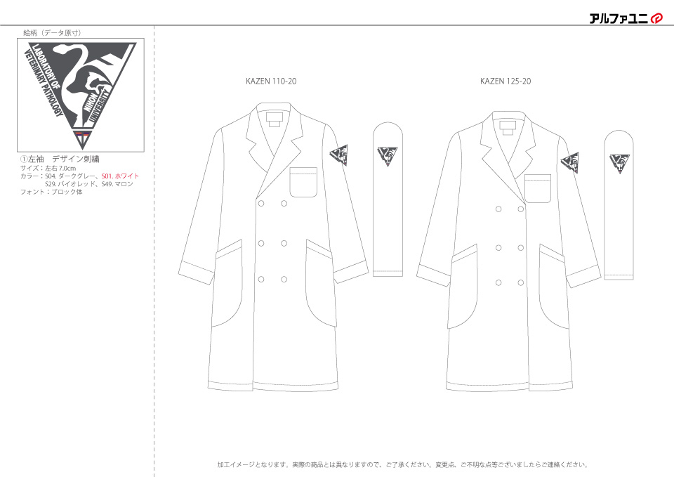 デザイン刺繍 日本大学獣医病理学研究室様 110-20 かっこいいドクターコート刺繍動画あり動物細かい文字袖複雑タイプ 日本大学獣医病理学研究室様ドクターコートロゴマーク刺繍デザインのご紹介です。 このたびは製作のご依頼ありがとうございました。 このデザインについて 刺繍位置 :左袖デザイン刺繍 刺繍サイズ:左右7cm 刺繍カラー:4色 ダークグレー・ホワイト・バイオレッド・マロン 使用ドクターコート:KAZEN 110-20メンズ診察衣、KAZEN 125-20レディス診察衣 この記事をシェア