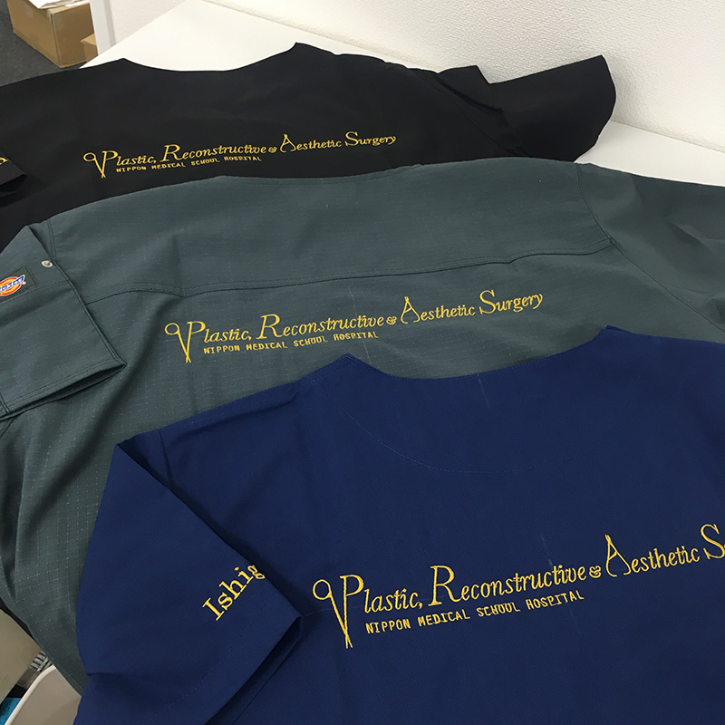 デザイン刺繍 日本医科大学病院形成美容外科様 Z1J15 Eランク背中 日本医科大学病院形成美容外科様スクラブ刺繍デザインのご紹介です。 製作のご依頼ありがとうございました。 このデザインについて 【刺繍加工のポイント】 背中の刺繍サイズは一般的に、SSなど女性要の小さいサイズに合わて左右28㎝に設定することがほとんどですが、 S.C.R.U.B.S. Z1J15 6ポケットトップは、袖部分に縫い目がないドルマンスリーブということで 加工できるスペースが広いため、30㎝の刺繍が可能です。 刺繍位置 :背中 刺繍サイズ:左右30cm 刺繍カラー:ゴールド この記事をシェア