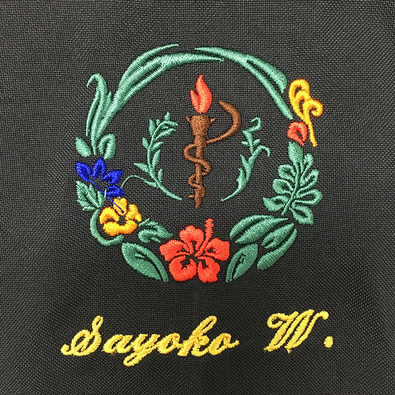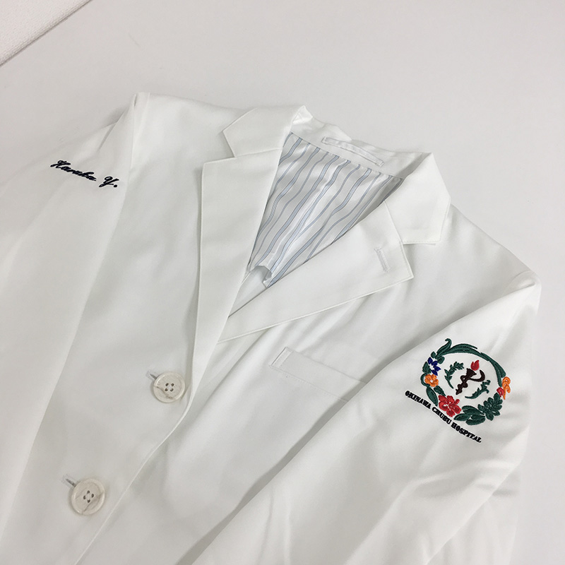 デザイン刺繍 沖縄県立中部病院2019年様 MZ-0018 CランクDランクカラフルかわいいドクターコートロゴマーク円形(丸型)デザイン袖複雑タイプ 沖縄県立中部病院2019様スクラブ・ジャケット・ドクターコートロゴマーク刺繍デザインのご紹介です。 刺繍デザインは2パターン、カラーパターンは2パターン×2配色 合計4パターンとなりました。 製作のご依頼ありがとうございました。 このデザインについて 刺繍位置 :左袖 刺繍サイズ:ロゴマーク 左右6cm、 ジンベイザメデザイン 左右7㎝ 刺繍カラーロゴマーク:5色 ワインレッド・ダークグリーン・オレンジ・ダークブラウン・ロイヤルブルー 刺繍カラージンベイザメ:3色 ホワイト・ブラック・ブルー 手書きラフデザインをご提供いただき、書き起こしと調整を行い、刺繍加工までトータルで対応させていただきました。 この記事をシェア