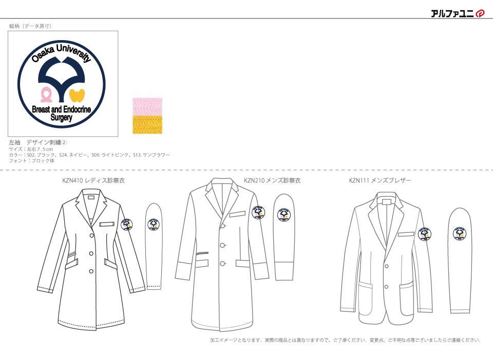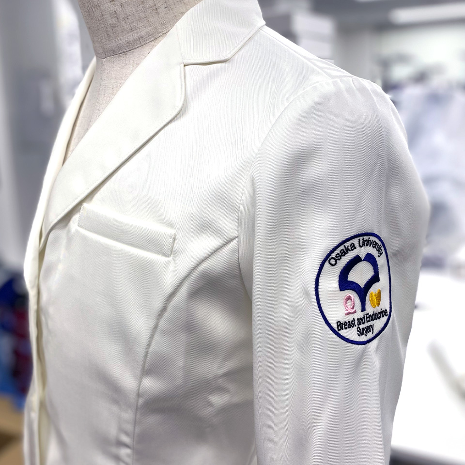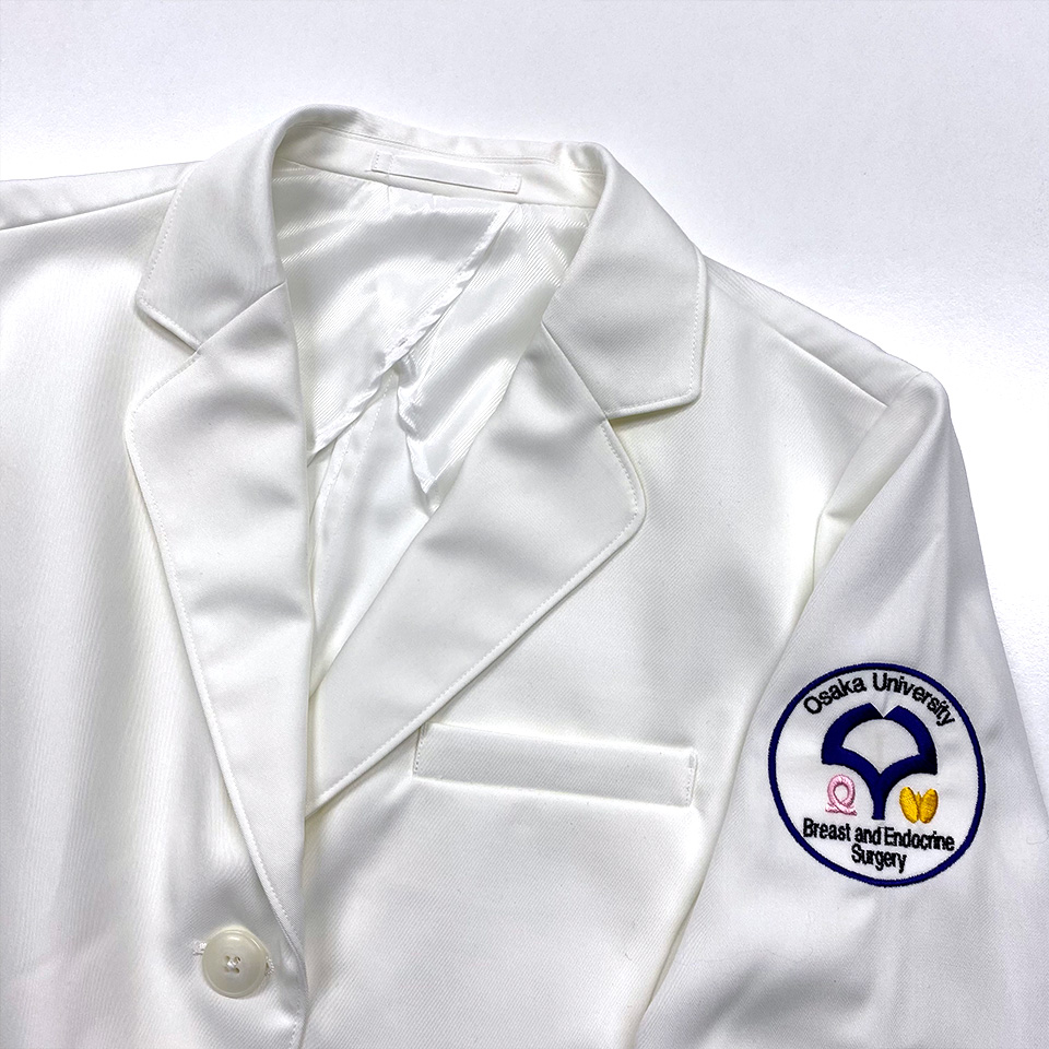 デザイン刺繍 大阪大学乳腺内分泌外科様 KZN410 Cランク円形(丸型)デザイン校章袖 大阪大学乳腺内分泌外科様ドクターコートロゴマーク刺繍デザインのご紹介です。このたびは製作のご依頼ありがとうございました。 このデザインについて 【刺繍加工のポイント】 すべてサテン打ちで仕上げました。 それにより、光沢があり、立体感のある仕上がりとなっています。 一般の方が見ると刺繍ワッペンのように見えると思いますが、こちらは直刺繍です。 ベースの生地がホワイトであるため、このような表現が可能となりますが、 スクラブなど色付きの生地に同じ刺繍をする場合は、白い生地の上に刺繍したワッペンを作成縫い付ける加工方法となります。 これがまさに刺繍ワッペンとなるわけです。 刺繍位置:左袖デザイン刺繍 刺繍サイズ:左右7.5cm 刺繍カラー:4色 ブラック、ネイビー、ライトピンク、サンフラワー 使用ドクターコート:BIANCA BY KAZEN KZN410レディス診察衣 この記事をシェア