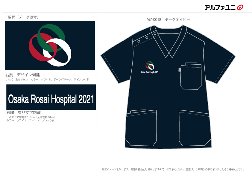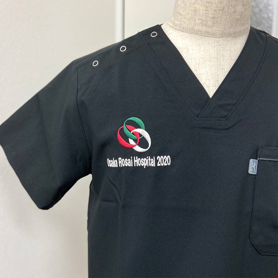 デザイン刺繍 大阪労災病院2020様 MZ-0018 Aランクロゴマーク胸 大阪労災病院2020様スクラブロゴマーク刺繍デザインのご紹介です。 とてもシンプルなデザインですっきりとした仕上がりになっています。このたびは製作のご依頼ありがとうございました。 このデザインについて 【刺繍加工のポイント】 デザイン+有り文字刺繍、全体で左右10cmとなっています。 右胸ということですべて10×10cmの四角枠を使用しますので、問題なく刺繍を入れることができますが、 こちらのデザインを袖に入れる場合は、袖用の枠は直径8㎝の円形となりますので、 マーク下の文字を左右8㎝に縮小する必要があります。 また、袖用の円形枠ということで、マークと文字を1つのデザインとしたときに全体が収まらない場合は、マークと文字を別々分けて加工することとなります。 刺繍位置:右胸デザイン刺繍、有り文字刺繍 刺繍サイズ:デザイン刺繍 左右5cm、有り文字刺繍 文字高さ1.3cm(全体左右10cm) 刺繍カラー:デザイン刺繍 3色 ホワイト・ダークグリーン・ワインレッド、有り文字刺繍 1色 ホワイト 使用スクラブ:MIZUNO MZ-0018スクラブ この記事をシェア
