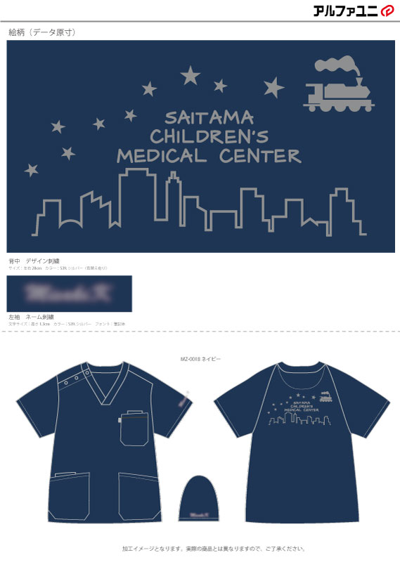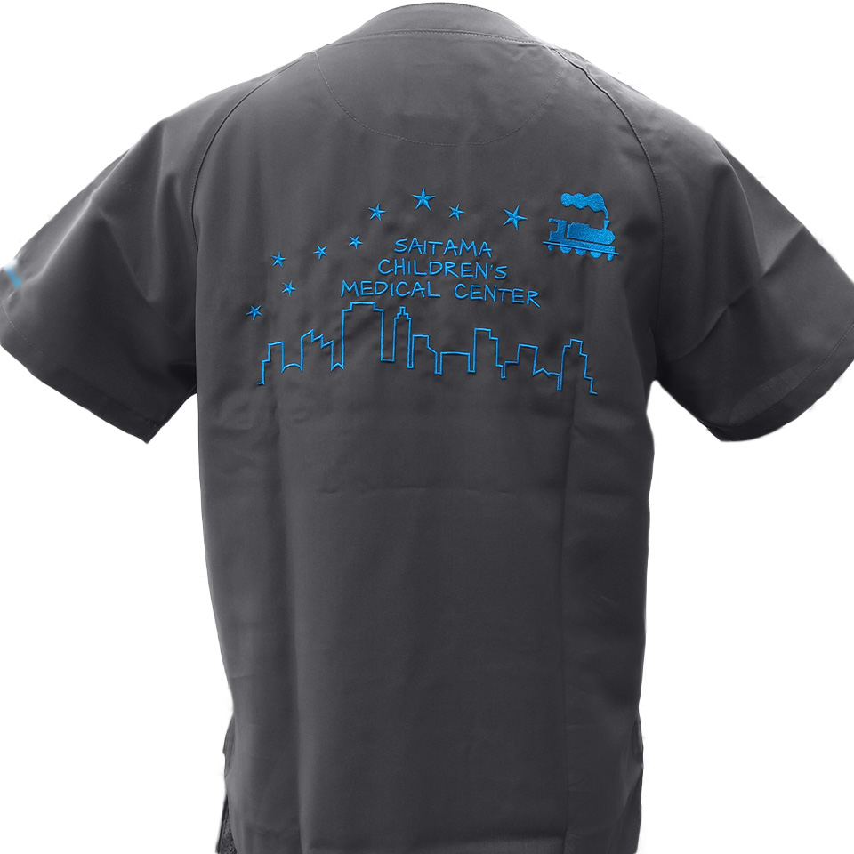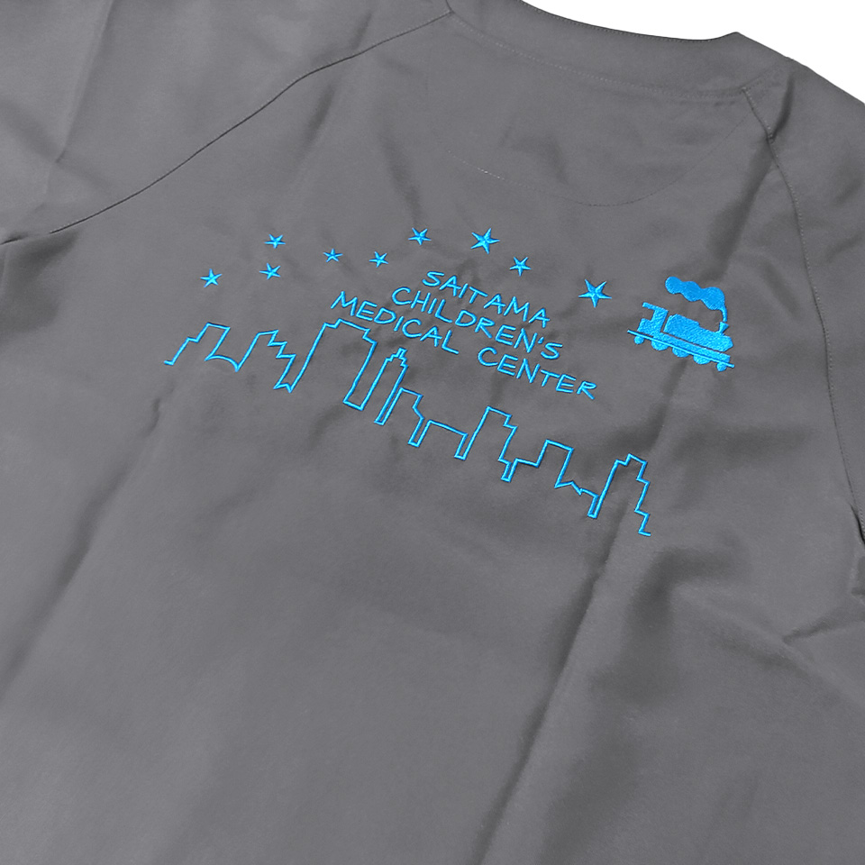 デザイン刺繍 埼玉県立小児医療センター集中治療科様 背中刺繍デザイン 1色Dランクかわいい乗り物建物星背中 埼玉県立小児医療センター集中治療科様スクラブ背中刺繍デザインのご紹介です。 2019年から、ほぼ毎年追加製作のご依頼をいただいております。いつもありがとうございます。 このデザインについて 【刺繍加工のポイント】 銀河鉄道の夜 宮沢賢治作を思わせる可愛いデザインを背中へ大きく入れました。 デザイン全体サイズは28×14.5cmとそれなりには大きいですが、機関車のイラスト以外は太めの罫線中心のデザインということで、実際に糸を打ち込む数(針数)は16000針程度でした。 そのためスタンダード刺繍(Dランク)となりました。 刺繍位置 :背中 刺繍サイズ:左右28cm 刺繍カラー:6色の中から1色 ホワイト・シルバー・イエロー・ゴールド・ダークブラウン・オーシャン 使用スクラブ:MIZUNO MZ-0018 スクラブ この記事をシェア