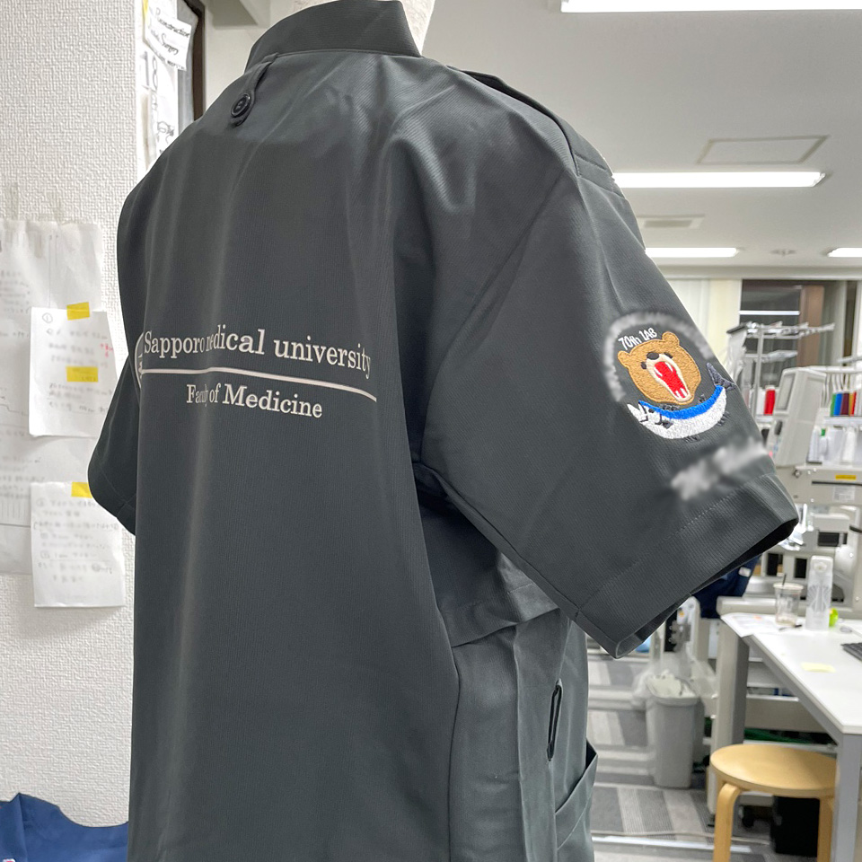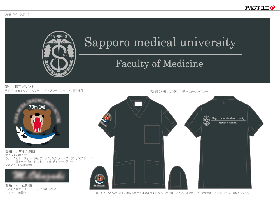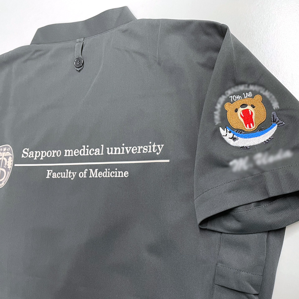 デザイン刺繍 札幌医科大学医学部70期様 72-630 Cランクカラフルかわいい円形(丸型)デザイン動物卒業記念袖複雑タイプ 札幌医科大学医学部70期様卒業記念スクラブロゴマーク刺繍デザインのご紹介です。 北海道ということで熊と鮭のイラストを組み合わせたデザインを左袖に刺繍しました。 このたびは製作のご依頼ありがとうございました。 このデザインについて 【刺繍加工のポイント】 熊のイラストの刺繍は、顔の中をたたみ打ちした後、縁取りをサテン打ちで入れました。 それによって顔の輪郭をくっきり表現することができました。 縁取りを入れないよりも仕上がりが良くなりますので、デザインによって縁取りを入れるかを判断します。 刺繍位置 :右袖デザイン刺繍/右袖ネーム刺繍 刺繍サイズ:天地7cm/高さ1.3cm 刺繍カラー:7色 ホワイト・ブラック・ライトブラウン・レッド・ベージュ・るり・チャコールグレー/1色 ホワイト 使用スクラブ:モンブラン 72-630 チャコールグレー その他加工:背中転写プリント この記事をシェア