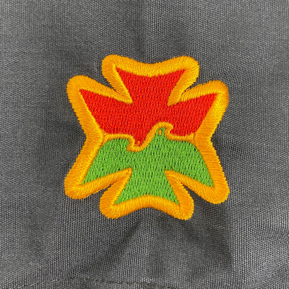 徳洲会のマークの刺繍については、サテン打ち(アウトライン)とたたみ打ち(マークの中)がバランス良く盛り込まれている刺繍デザインです。