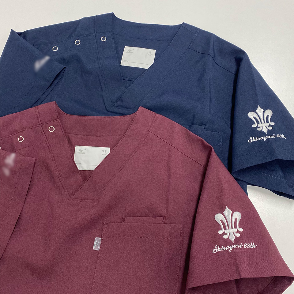 スクラブ刺繍位置:左袖デザイン刺繍/右袖ネーム刺繍
