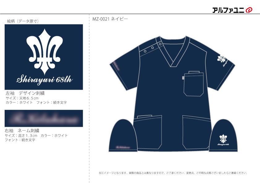 スクラブ刺繍カラー:左袖デザイン刺繍 1色 ホワイト/右袖ネーム刺繍 1色 ホワイト