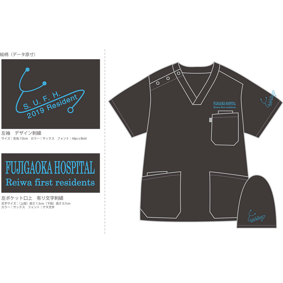 デザイン刺繍 昭和大学附属藤が丘病院2019研修医様 1色シンプル細かい文字聴診器袖 昭和大学附属藤が丘病院2019研修医様スクラブ刺繍デザインのご紹介です。製作のご依頼ありがとうございました。 このデザインについて 【刺繍加工のポイント】 左ポケット口上の刺繍サイズは全体で左右9cmです。 胸の刺繍サイズは10cmまでを推奨しておりますが、左右9cmの幅に入る文字数としては2段目の20文字がほぼ限界となります。 小文字で高さ4.5㎜だからです。 刺繍位置 : 左袖/左ポケット口上 刺繍サイズ: 左右7㎝/左右9㎝ 刺繍カラー: 1色 サックス 有り文字刺繡書体:足付書体 この記事をシェア
