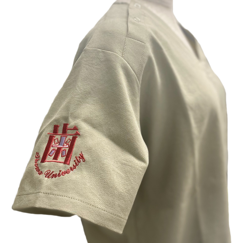 また、「歯」の下の「Showa University」の文字の配置は、ストレートにすると円形の刺繍枠に収まらないため、逆アーチで配置して収めています。