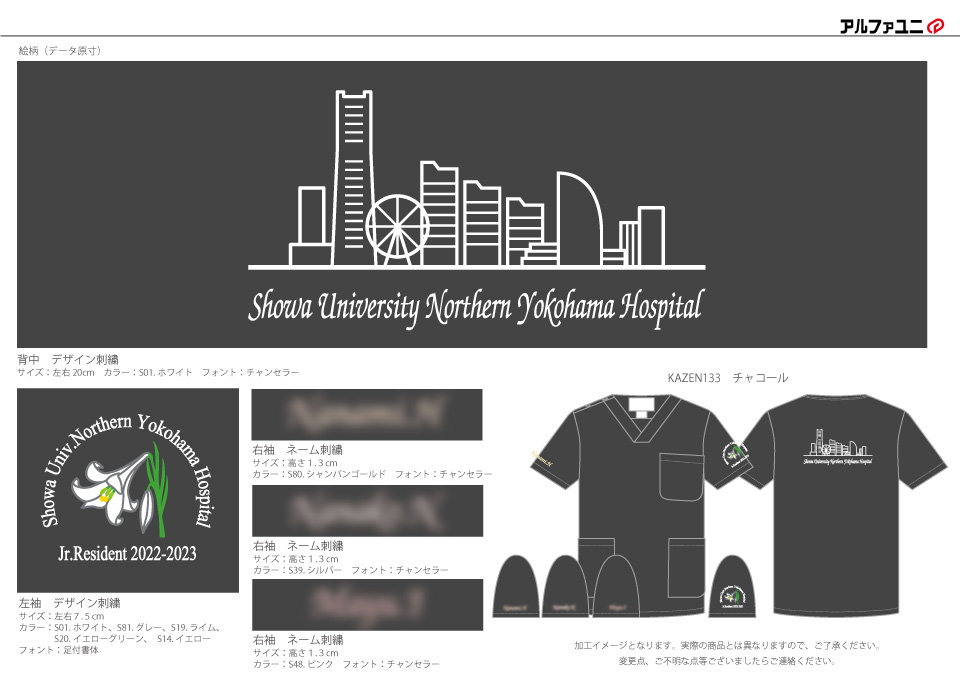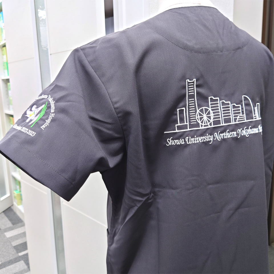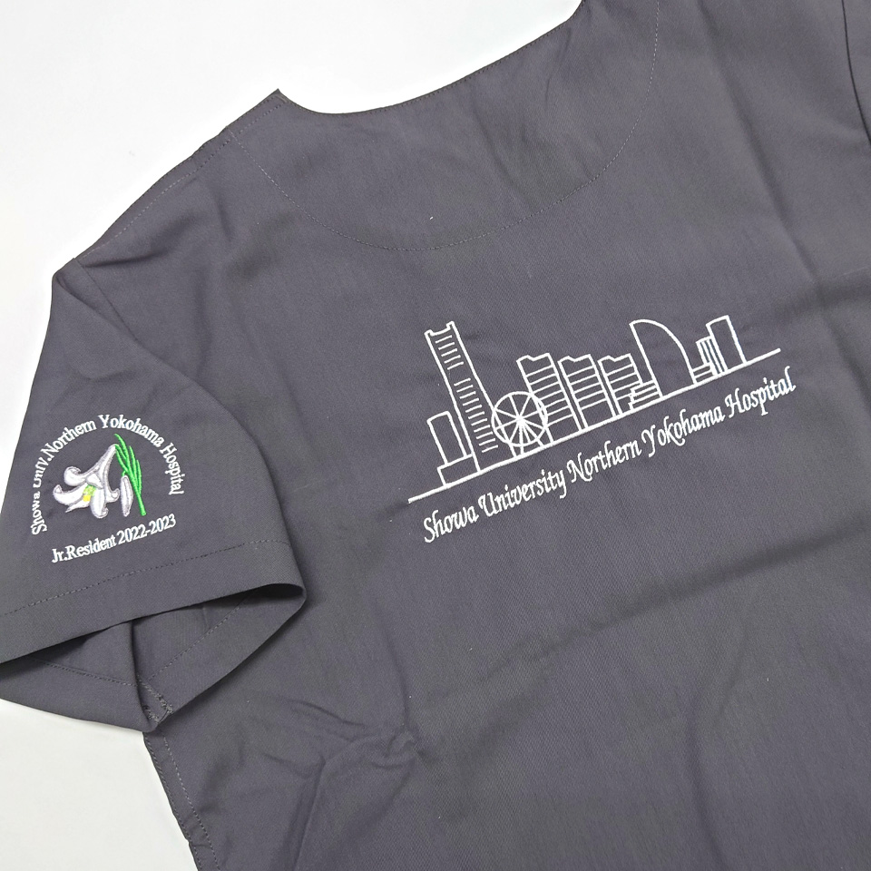 デザイン刺繍 昭和大学横浜市北部病院 2022年研修医様 133スクラブ 刺繍動画あり建物背中花袖複雑タイプ 昭和大学横浜市北部病院2022年研修医様スクラブロゴマーク刺繍デザインのご紹介です。 背中、右袖の2ヶ所デザイン刺繍を入れました。 このたびは製作のご依頼ありがとうございました。 このデザインについて 【刺繍加工のポイント】 刺繍加工のポイントというよりは、デザインの簡素化がポイントです。 当初いただいたデザインはインターネットからDLした横浜の夜景のイラスト画像でしたが、 これをこのまま刺繍することが不可能であることをご説明した上で、 刺繍針数=刺繍代を抑えるということで、デザインを大幅に簡素化しました。 刺繍位置 :背中デザイン刺繍/左袖デザイン刺繍/右袖ネーム刺繍 刺繍サイズ:左右20cm/左右7.5cm/高さ1.3cm 刺繍カラー:1色 ホワイト/5色 ホワイト・グレー・ライム・イエローグリーン・イエロー/3色から1色選択 ピンク・シルバー・シャンパンゴールド この記事をシェア