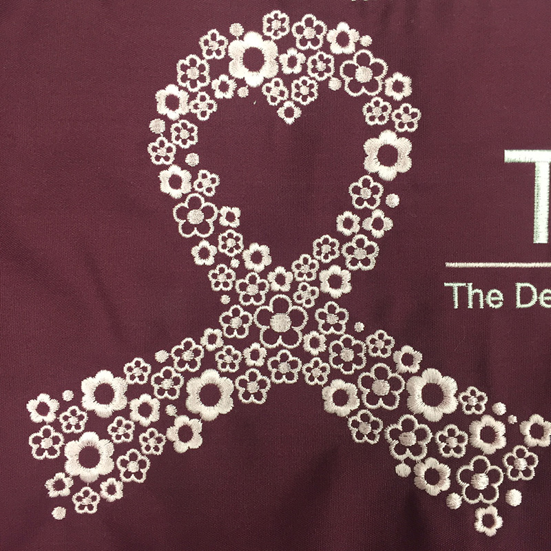 デザイン刺繍 東京医科大学附属病院乳腺科様 Hランク背中花複雑タイプ 東京医科大学附属病院乳腺科様スクラブ刺繍デザインのご紹介です。 製作のご依頼ありがとうございました。 このデザインについて 【刺繍加工のポイント】 刺繍加工は、柄と柄離れている場合、次の場所に移動するときに、 自動糸切り設定ができるようになっていますが、 こちらのデザインのように小さく同じようなサイズの柄連続している場合、 自動糸切りを連続的にすると機械に大きな負担がかかり、不具合が生じます。 そのため、柄間を極力近づけるようにデザイン調整をして、糸切りをせずに、つなげて刺繍をしても 違和感のないようにしました。アップ画像をご覧ください。実は各オブジェクトが1本糸でつながっています。 それによって刺繍機械への負担を最小限に抑えて、綺麗に加工をすることができました。 刺繍位置 :背中 刺繍サイズ:左右28cm 刺繍カラー:2色 ホワイト・ピンク この記事をシェア