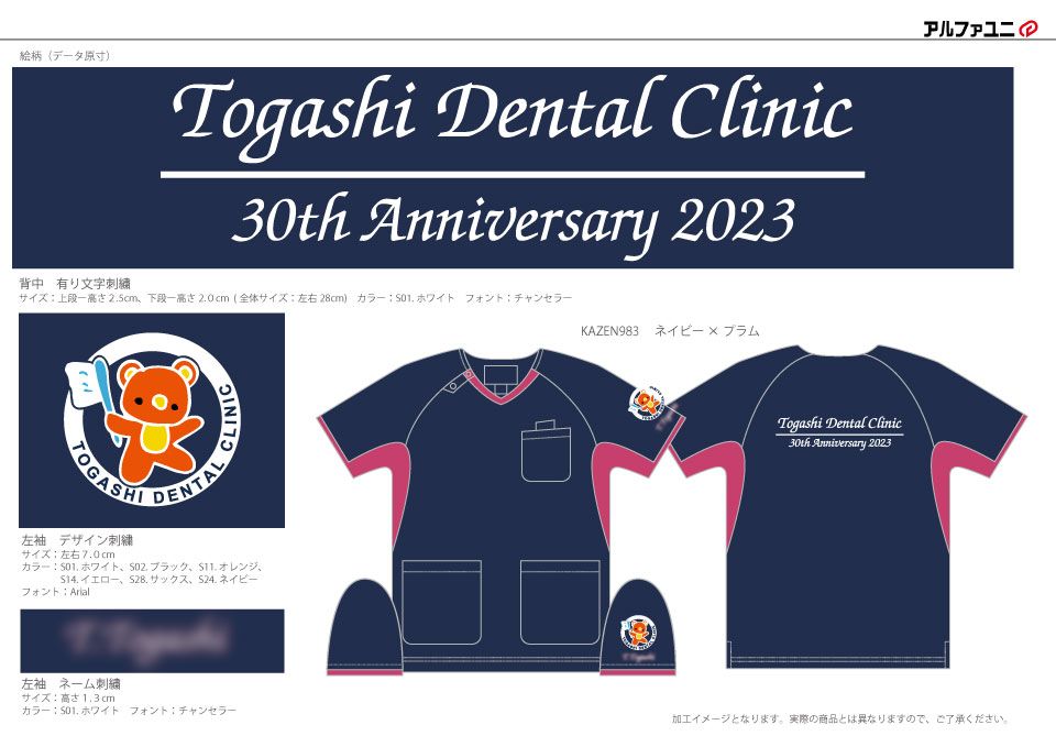デザイン刺繍 とがし歯科医院様 左袖刺繍デザイン Cランクカラフルかわいい円形(丸型)デザイン動物細かい文字袖 とがし歯科医院様スクラブ左袖刺繍デザインのご紹介です。このたびは製作のご依頼ありがとうございました。 このデザインについて 【刺繍加工のポイント】 使用スクラブはKAZEN983です。ニット素材で柔らかく伸縮性の高い生地ということで、糸の打ち込み本数の多い円形の帯の刺繍について、2枚しっかり芯地をいれてもどうしても歪みがでてしまいました。本来このようなデザインは、円形のワッペンにして縫い付けたほうが綺麗に仕上がります。しかし、お客様のご希望で、キャラクターが円形をはみ出すデザインのため、直刺繍で対応しました。 デザイン的に針数が増え、約14000針のこだわり刺繍(Cランク)となりました。 刺繍位置 :左袖 刺繍サイズ:左右7cm 刺繍カラー:6色 ホワイト・ブラック・オレンジ・イエロー・サックス・ネイビー 使用スクラブ:KAZEN 983 スクラブ この記事をシェア