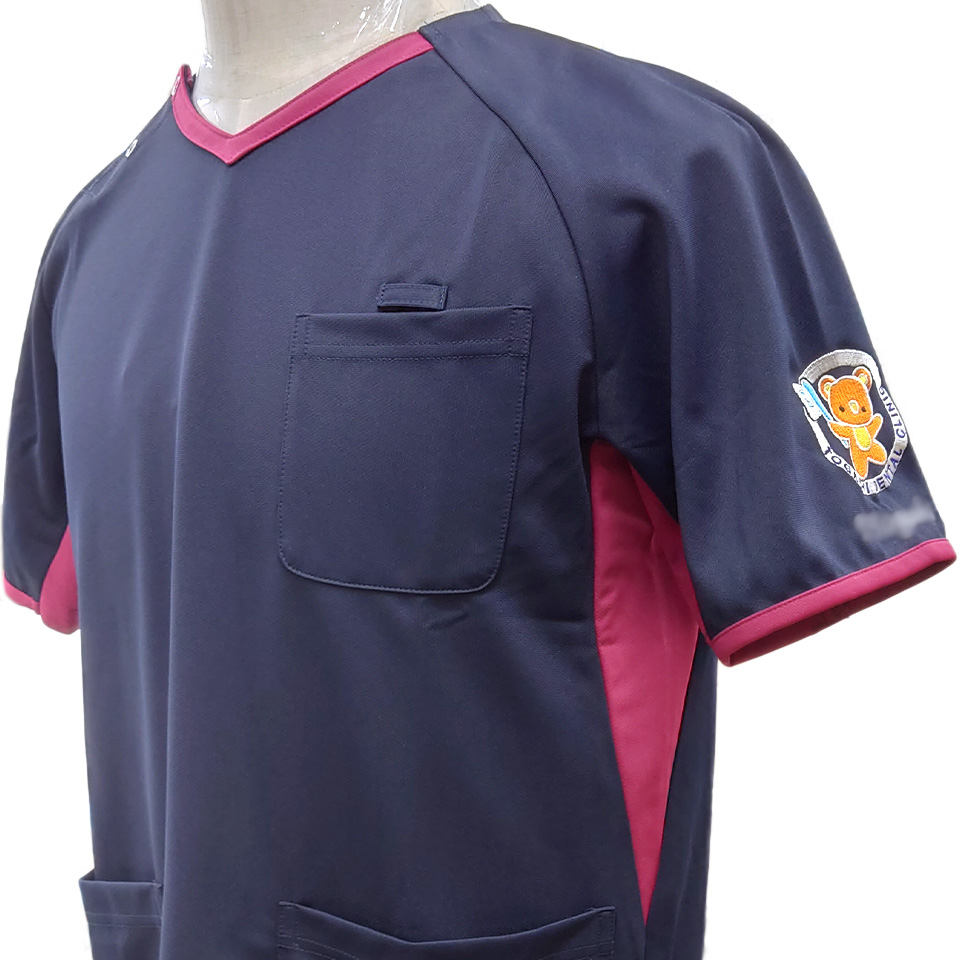 使用スクラブはKAZEN983です。ニット素材で柔らかく伸縮性の高い生地ということで、糸の打ち込み本数の多い円形の帯の刺繍について、2枚しっかり芯地をいれてもどうしても歪みがでてしまいました。本来このようなデザインは、円形のワッペンにして縫い付けたほうが綺麗に仕上がります。しかし、お客様のご希望で、キャラクターが円形をはみ出すデザインのため、直刺繍で対応しました。