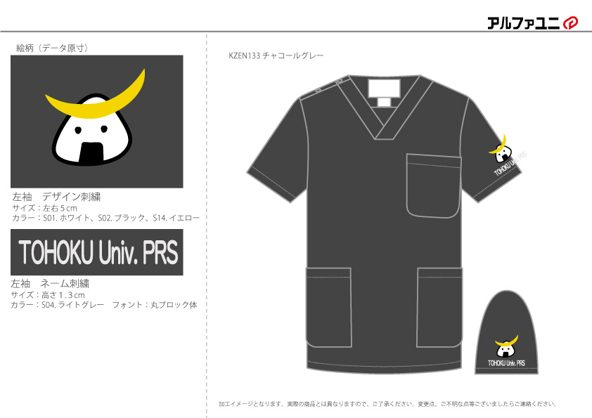 デザイン刺繍 東北大学医学部形成外科様 133スクラブ Aランクかわいいキャラクター袖 東北大学医学部形成外科様スクラブロゴマーク刺繍デザインのご紹介です。 このたびは製作のご依頼ありがとうございました。 このデザインについて 【刺繍加工のポイント】 仙台・宮城観光PRキャラクター「むすび丸」のデザイン刺繍です。 各オブジェクトはたたみ打ちで刺繍しております。 ホワイトの顔部分とイエローの頭飾り(立物)部分のたたみ打ち角度を変え、さらにはサテン打ちで縁取りをすることで、立体感を出しています。 刺繍位置 :左袖デザイン刺繍/左袖ネーム刺繍 刺繍サイズ:左右5cm/高さ1.3cm 刺繍カラー:3色 ホワイト・ブラック・イエロー/1色 ライトグレー 使用スクラブ:KAZEN 133スクラブ(男女兼用) この記事をシェア