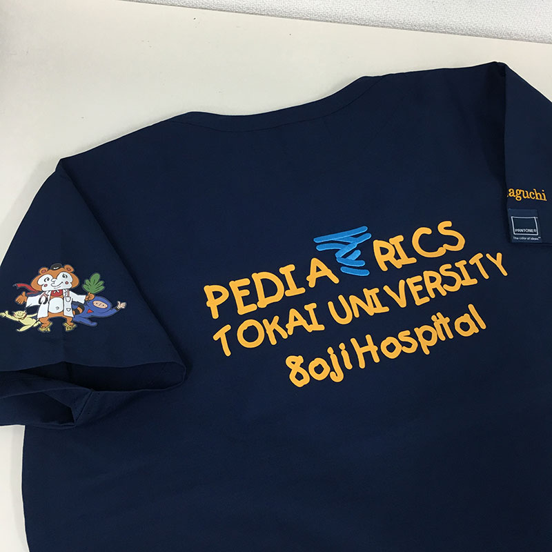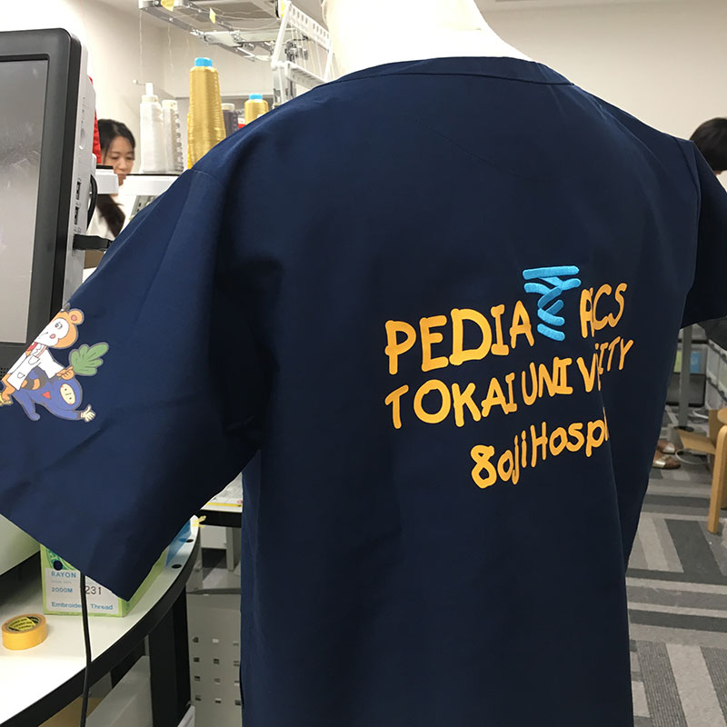 デザイン刺繍 東海大学附属病院小児科2020様 Bランクかわいい背中 東海大学附属病院小児科2020様スクラブロゴマーク刺繍デザインのご紹介です。このたびは製作のご依頼ありがとうございました。 このデザインについて 【刺繍加工のポイント】 背中の加工はシルクプリントと刺繍を組み合わせています。 Twaveマークが刺繍なので、立体感と存在感がアップしています。 Twaveマークをプリントに合わせるのは人の手と目になります。 若干のズレについては事前に許容いただけることを了承いただきました。 また、Twaveマークは承認を取った上で、プリントのフォントに近づけるようアレンジしました。 刺繍位置 :背中 刺繍サイズ:プリント含めた全体左右28cm、Twaveマークのみ天地約5.3㎝ 刺繍カラー:プリント オレンジ、刺繍 サックス その他加工:背中1色シルクプリント その他加工2:左袖CAM転写プリント 使用スクラブ:FOLK 7000SCスクラブ ミッドナイトネイビー この記事をシェア