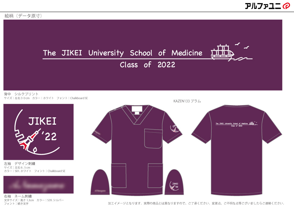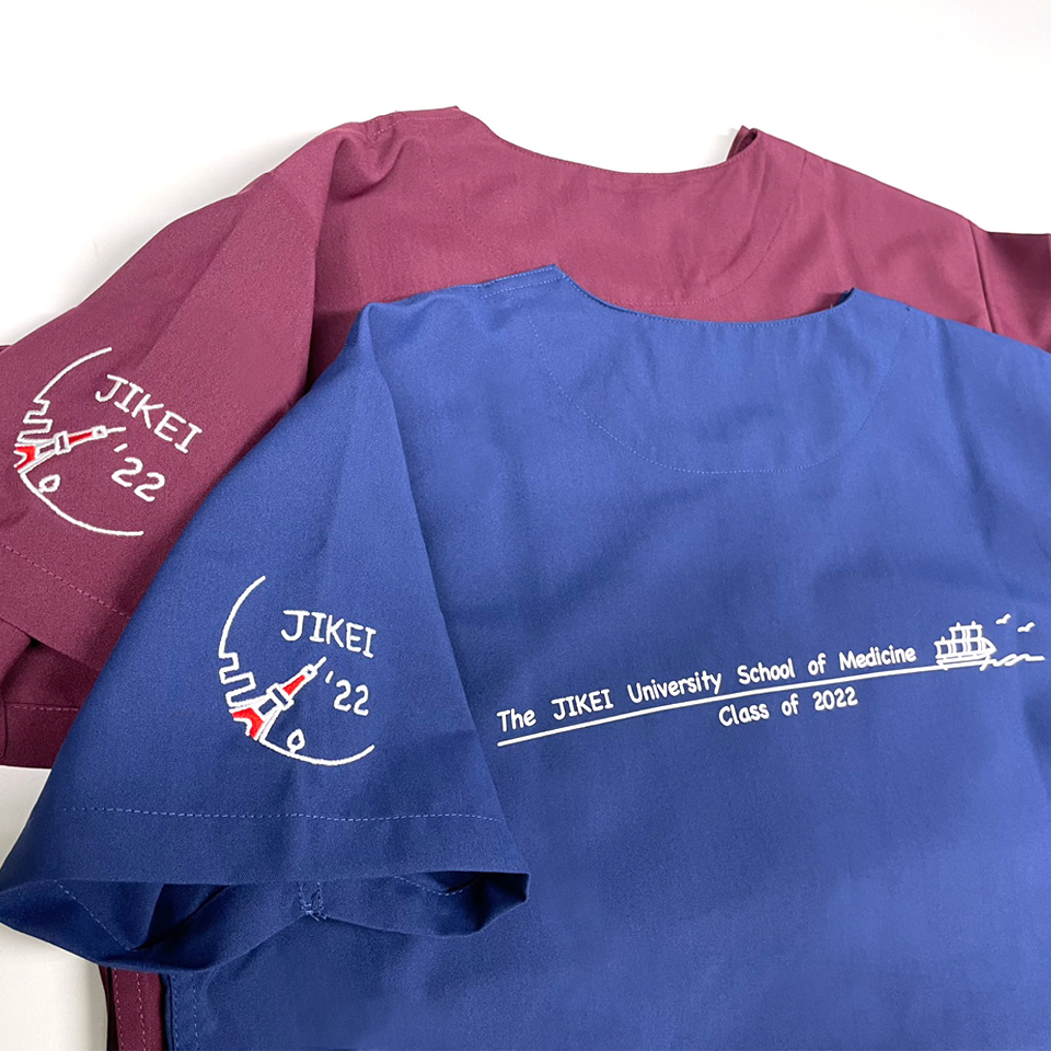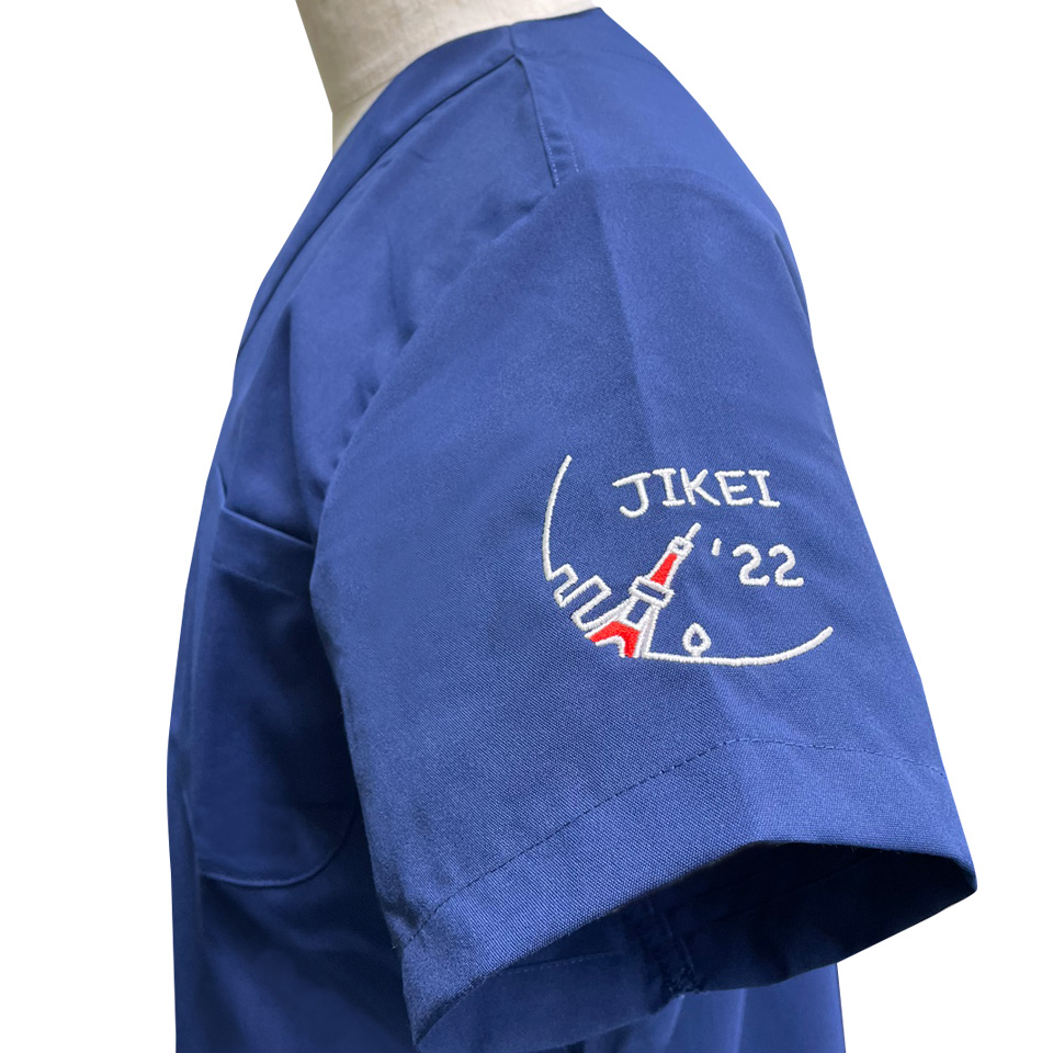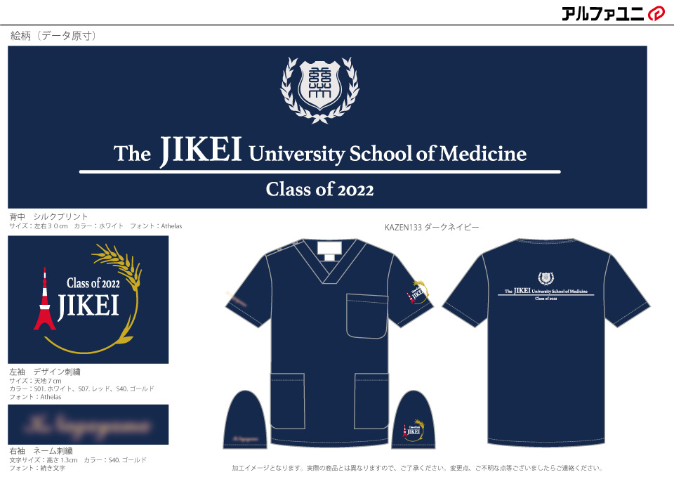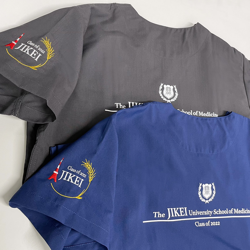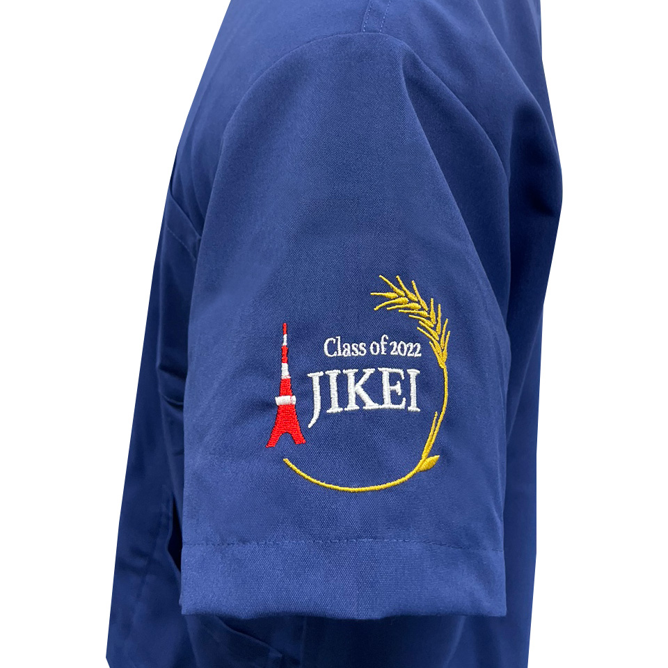 デザイン刺繍 東京慈恵会医科大学class of 2022様 133スクラブ Cランク円形(丸型)デザイン卒業記念建物袖 東京慈恵会医科大学2022様卒業記念スクラブロゴマーク刺繍デザインのご紹介です。このたびは製作のご依頼ありがとうございました。 このデザインについて 【刺繍加工のポイント】 デザインが、A(東京タワーと稲穂のタイプ)とB(東京タワーと街並みのタイプ)の2タイプございます。 A、Bタイプともにすべてサテン打ちです。 ———————————————————————— A(東京タワーと稲穂のタイプ) 刺繍位置 :左袖デザイン刺繍/右袖ネーム刺繍 刺繍サイズ:天地7cm/高さ1.3cm 刺繍カラー:3色 ホワイト・レッド・ゴールド/1色 ゴールド ———————————————————————— B(東京タワーと街並みのタイプ) 刺繍位置 :左袖デザイン刺繍/右袖ネーム刺繍 刺繍サイズ:左右6.5cm/高さ1.3cm 刺繍カラー:2色 ホワイト・レッド/1色 シルバー ———————————————————————— 使用スクラブ:KAZEN 133スクラブ(男女兼用) この記事をシェア
