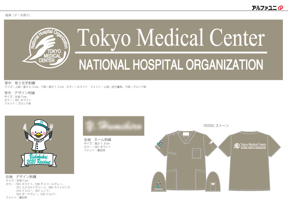 デザイン刺繍 東京医療センター研修医様 背中刺繍デザイン 1色シンプル背中 東京医療センター研修医様スクラブ背中刺繍デザインのご紹介です。このたびは製作のご依頼ありがとうございました。 このデザインについて 【刺繍加工のポイント】 マークはデザイン刺繍で、2段+ラインのフォント刺繍を組み合わせたデザインです。 型代はマークのみとなりますので、コストメリットがあります。フォント刺繍の書体はブロック体です。 刺繍位置 :背中デザイン刺繍+フォント刺繍 刺繍サイズ:左右7cm+上段高さ2.5cm、下段高さ1.5cm、ライン左右28cm 刺繍カラー:どちらも1色 ホワイト 使用スクラブ:Dickies 7033SCスクラブ この記事をシェア