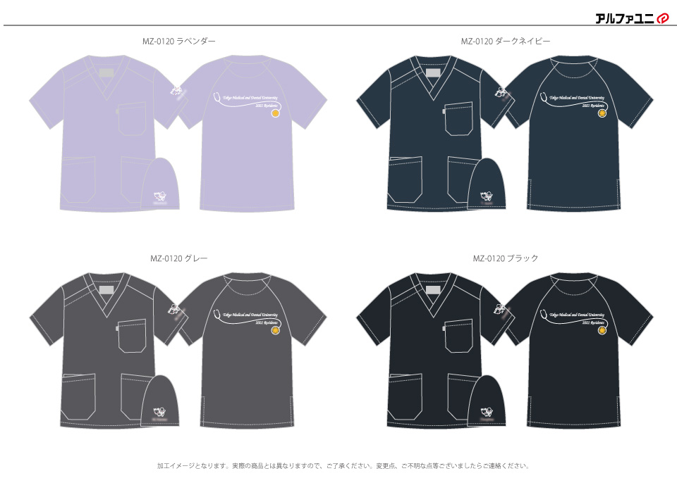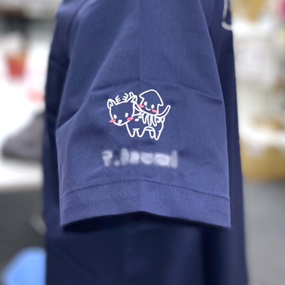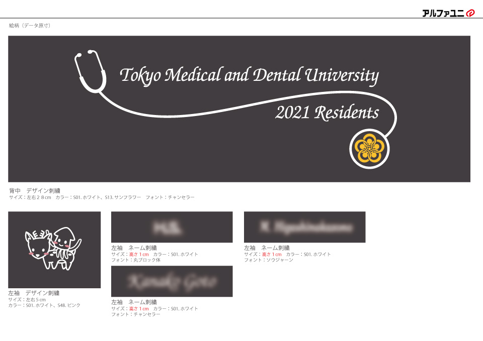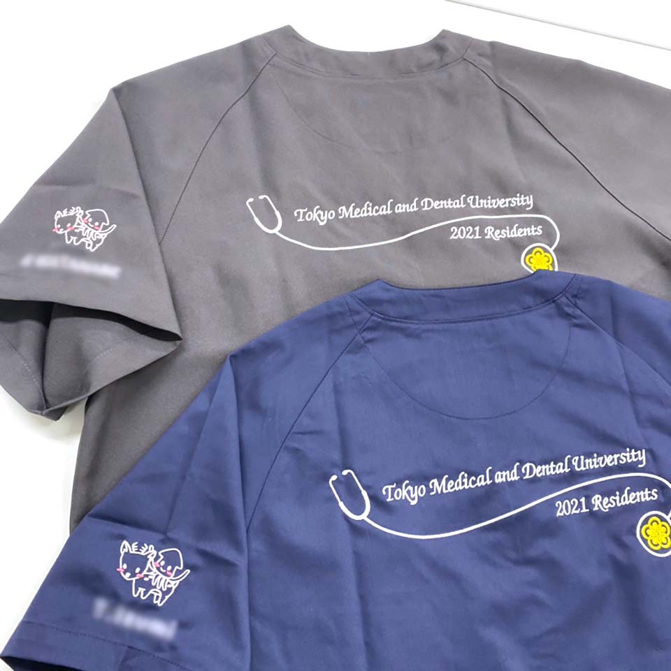 デザイン刺繍 東京医科歯科大学病院2021年研修医様 MZ-0021 AランクDランクかわいい動物校章聴診器 東京医科歯科大学病院2021年研修医様スクラブロゴマーク刺繍デザインのご紹介です。 このたびは製作のご依頼ありがとうございました。 このデザインについて 【刺繍加工のポイント】 背中の刺繍について補足です。 デザインの定番となっている聴診器と文字2段の組み合わせデザインは、聴診器のチェストピースの円の中に東京医科歯科大学様のシンボルマーク(校章)を入れるデザインとなっています。 こちらのマークサイズが約2.5cm、チェストピースの円が3.5cmでした。 マークは複数の円形のオブジェクトが重なっているデザインで、その隙間がかなり狭くなっており、くっ付いてしまうほどの隙間となっています。 プリントであれば、オブジェクトがくっつくと完全に一体化してしまいますが、刺繍の場合は刺繍型(パンチデータ)が別々になっていてそれぞれ分けて刺繍しますので、境目が確認できます。 刺繍位置 :背中/左袖デザイン刺繍、ネーム刺繍 刺繍サイズ:左右28cm/デザイン刺繍左右5cm、ネーム刺繍高さ1cm 刺繍カラー:2色 ホワイト・サンフラワー/デザイン刺繍2色 ホワイト・ピンク、ネーム刺繍1色 ホワイト 使用スクラブ:MIZUNO MZ-0021スクラブ この記事をシェア