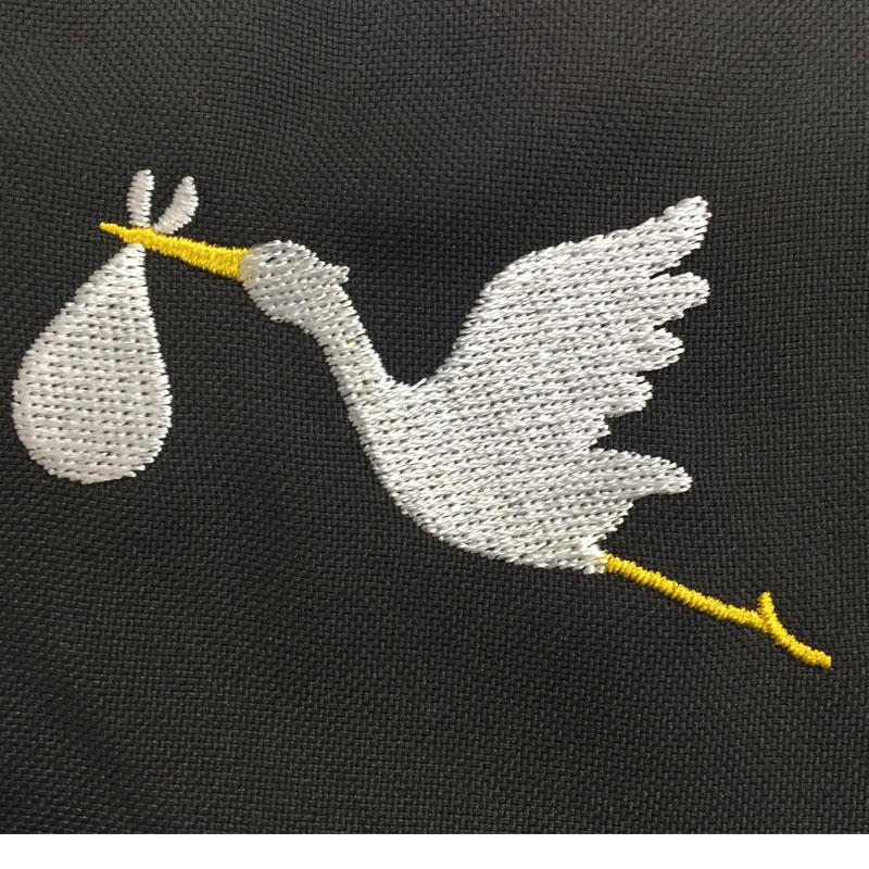 コウノトリのデザインを刺繍しましたが、サテン打ちとたたみ打ちの2種類でサンプルを上げましたが、最終的にはサテン打ちで量産加工をして納品しました。