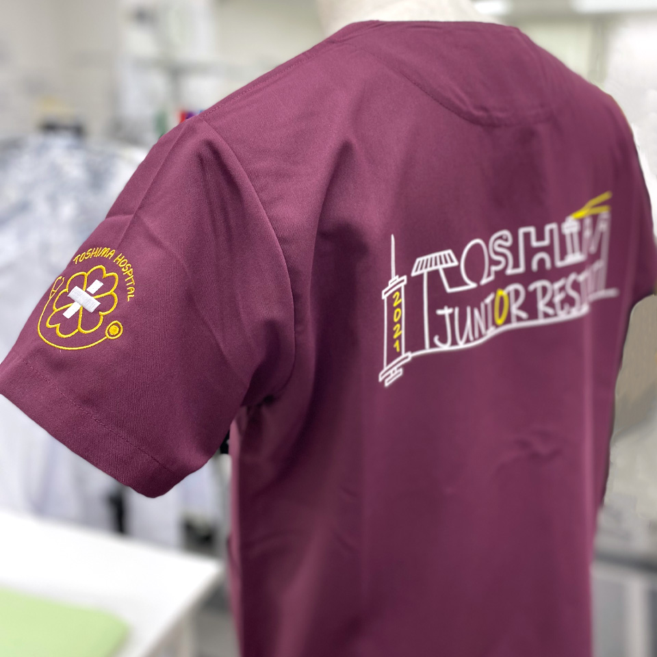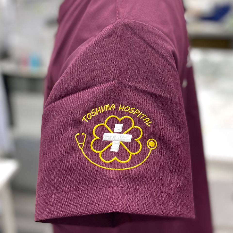 デザイン刺繍 豊島病院2021年研修医様 133スクラブ Cランクかわいいロゴマーク聴診器袖 豊島病院2021年研修医様スクラブロゴマーク刺繍デザインのご紹介です。このたびは製作のご依頼ありがとうございました。 このデザインについて 【刺繍加工のポイント】 デザイン中央のTマーク部分は太めのデザインとなっておりますが、すべてサテン打ちで仕上げてます。 白のTマーク部分の太さは約7㎜となっていますが、サテン打ちで刺繍できる限界の太さとなります。 刺繍位置 :左袖デザイン刺繍/右袖ネーム刺繍 刺繍サイズ:左右8cm/高さ1.3cm 刺繍カラー:左袖デザイン刺繍2色 ホワイト・ゴールド/右袖ネーム刺繍1色 ホワイト 使用スクラブ:KAZEN133スクラブ この記事をシェア