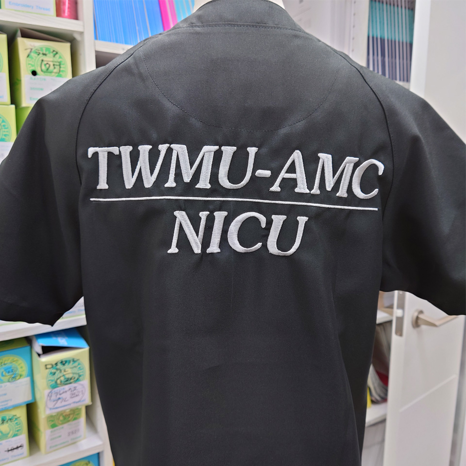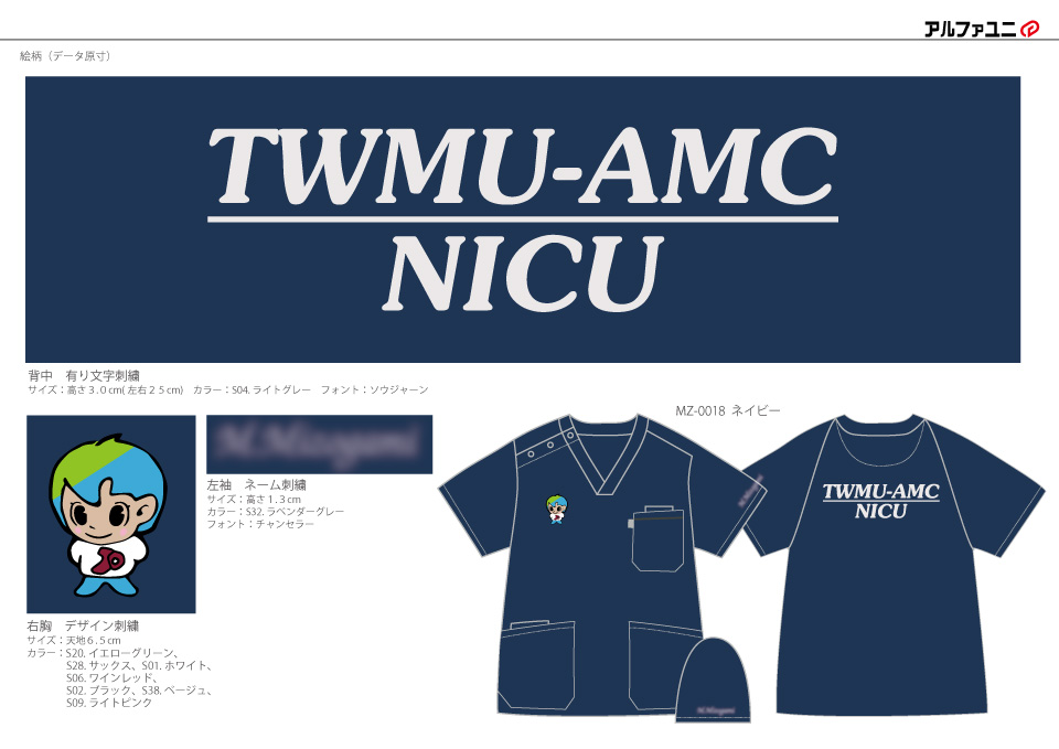 東京女子医科大学附属足立医療センター新生児科様チームスクラブロゴマーク刺繍デザインのご紹介です。