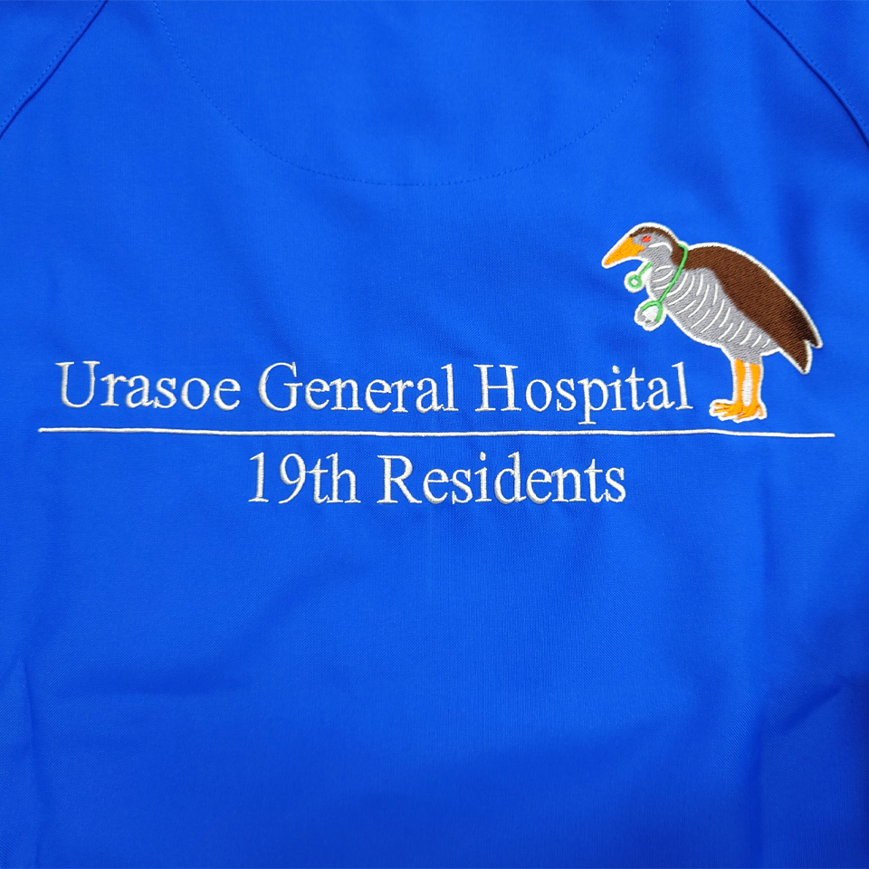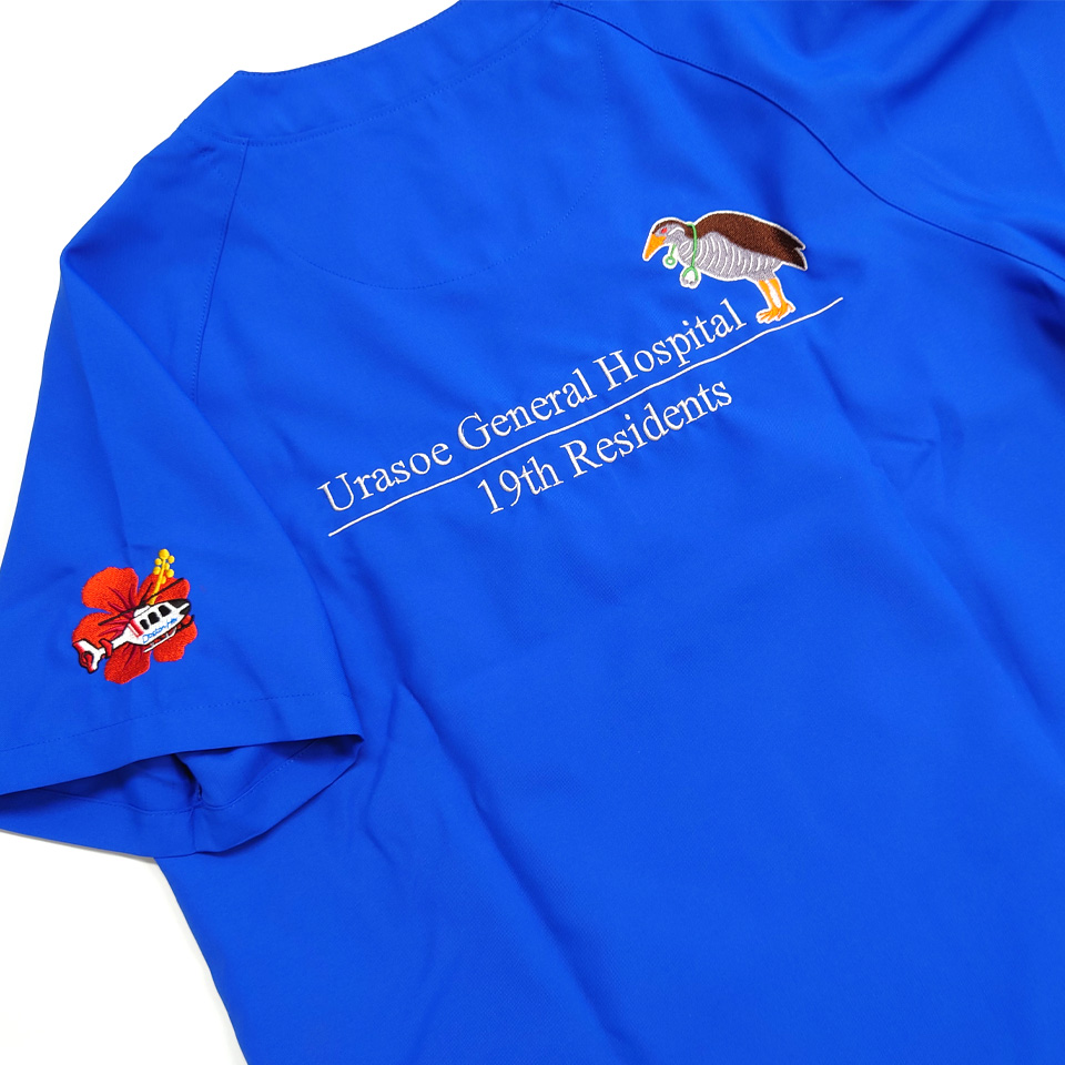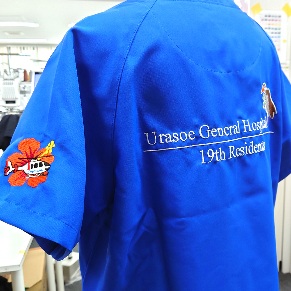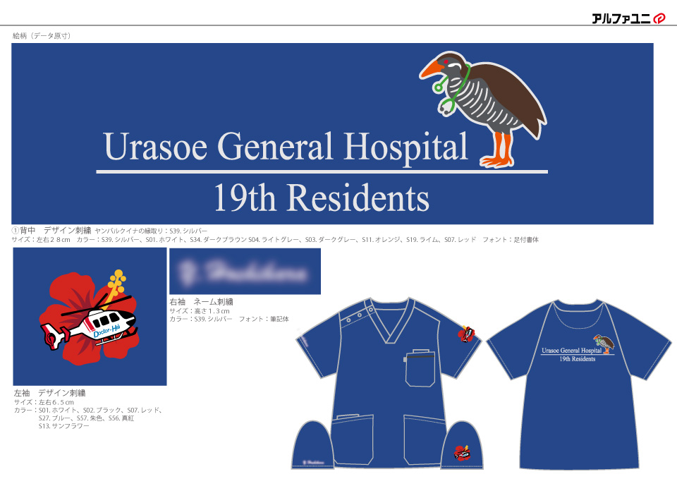 デザイン刺繍 浦添総合病院19期研修医様 MZ-0018 ドクターヘリ刺繍動画あり動物聴診器背中花袖複雑タイプ 浦添総合病院19期研修医様チームスクラブロゴマーク刺繍デザインのご紹介です。 背中と左袖2ヶ所にかなり豪華なデザインの刺繍を入れました。 このたびは製作のご依頼ありがとうございました。 このデザインについて 【刺繍加工のポイント】 背中は有り文字刺繍をベースにヤンバルクイナのイラストのみデザイン刺繍で対応しました。 ヤンバルクイナのイラストはイラストの周りをホワイトで縁取ったこともあり、それだけで1万針くらいとなりました。 それによって全体としてもかなりの針数となっています。 袖のデザインについてもハイビスカスの部分はすべてたたみ打ちで埋めていますので、こちらも針数の多い刺繍と なっています。ブルーのスクラブにレッドのハイビスカスが映えています。 袖のドクターヘリのデザインはアウトラインをブラックの線で囲んでいますが、かなり細い線なので、 その線が抑えとなってオブジェクトの抜き合わせが若干ずれた場合でもきれいに仕上げることができます。 刺繍位置 :左袖デザイン刺繍/背中デザイン刺繍/右袖ネーム刺繍 刺繍サイズ:左右6.5cm/左右28cm/高さ1.3cm 刺繍カラー:7色 ホワイト・ブラック・レッド・ブルー・朱色・真紅・サンフラワー/8色 ホワイト・シルバー・ダークブラウン・ライトグレー・ダークグレー・オレンジ・ライム・レッド/1色 シルバー この記事をシェア