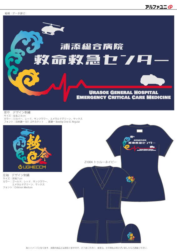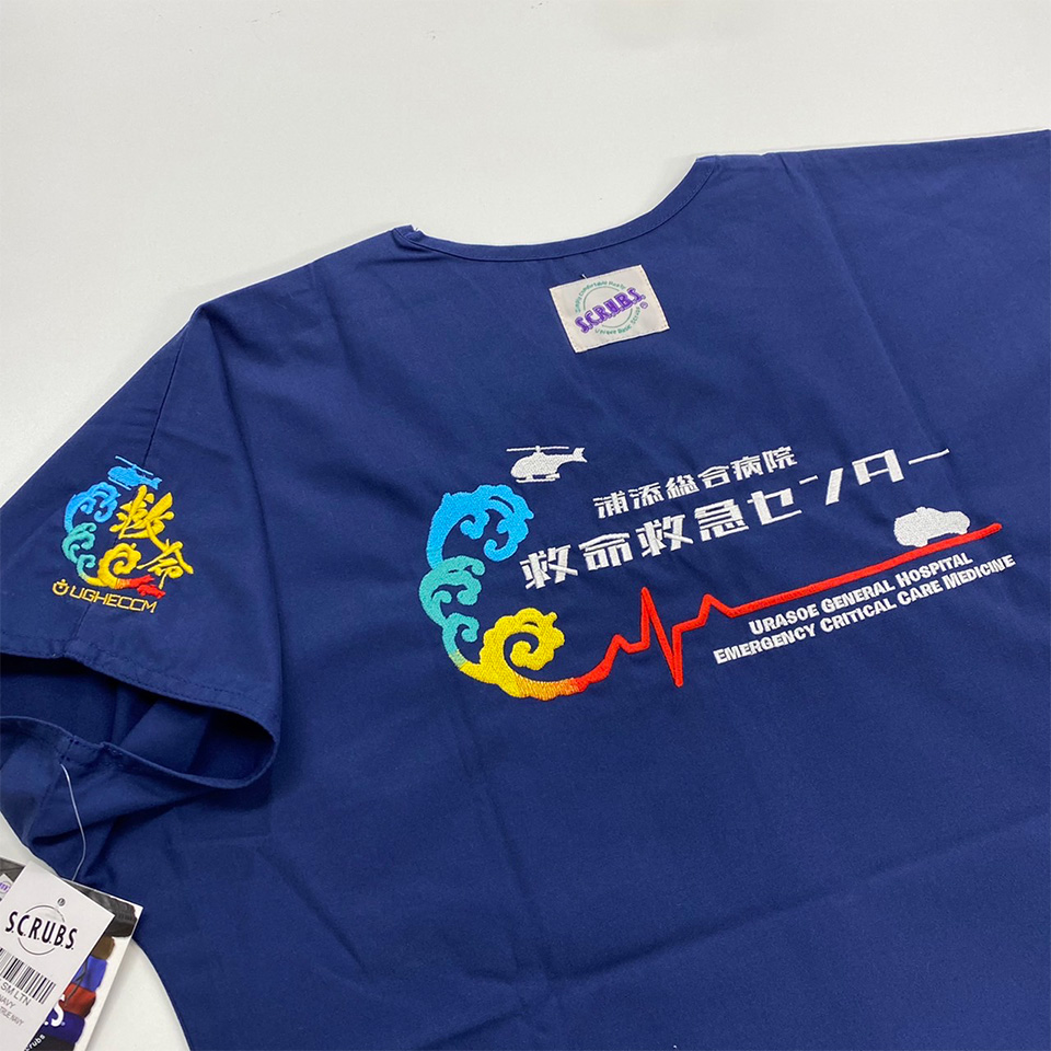 デザイン刺繍 浦添総合病院救命救急センター2021様 CランクDランクカラフルドクターヘリ乗り物心電図背中袖複雑タイプ 浦添総合病院救命救急センター2021様スクラブロゴマーク刺繍デザインのご紹介です。このたびは製作のご依頼ありがとうございました。 このデザインについて 【刺繍加工のポイント】 お客様のご要望がグラデーション表現を入れたいとのことでしたので、一部グラデーションを刺繍で表現しております。 袖のデザインについては打ち方がサテン打ちのため、たたみ打ちのように細かく打てない関係でラフな仕上がりとなっております。遠目に見るとグラデーションらしく見えますが、限界があることについて事前にサンプル画像をご確認いただきご了承いただき製作を進めました。 刺繍位置 :左袖/背中 刺繍サイズ:天地7cm/左右28cm 刺繍カラー:5色 ゴールド・レッド・サンフラワー・エメラルドグリーン・サックス/5色 シルバー・レッド・サンフラワー・エメラルドグリーン・サックス 使用スクラブ:スクラブス Z1004 3ポケットトップ この記事をシェア